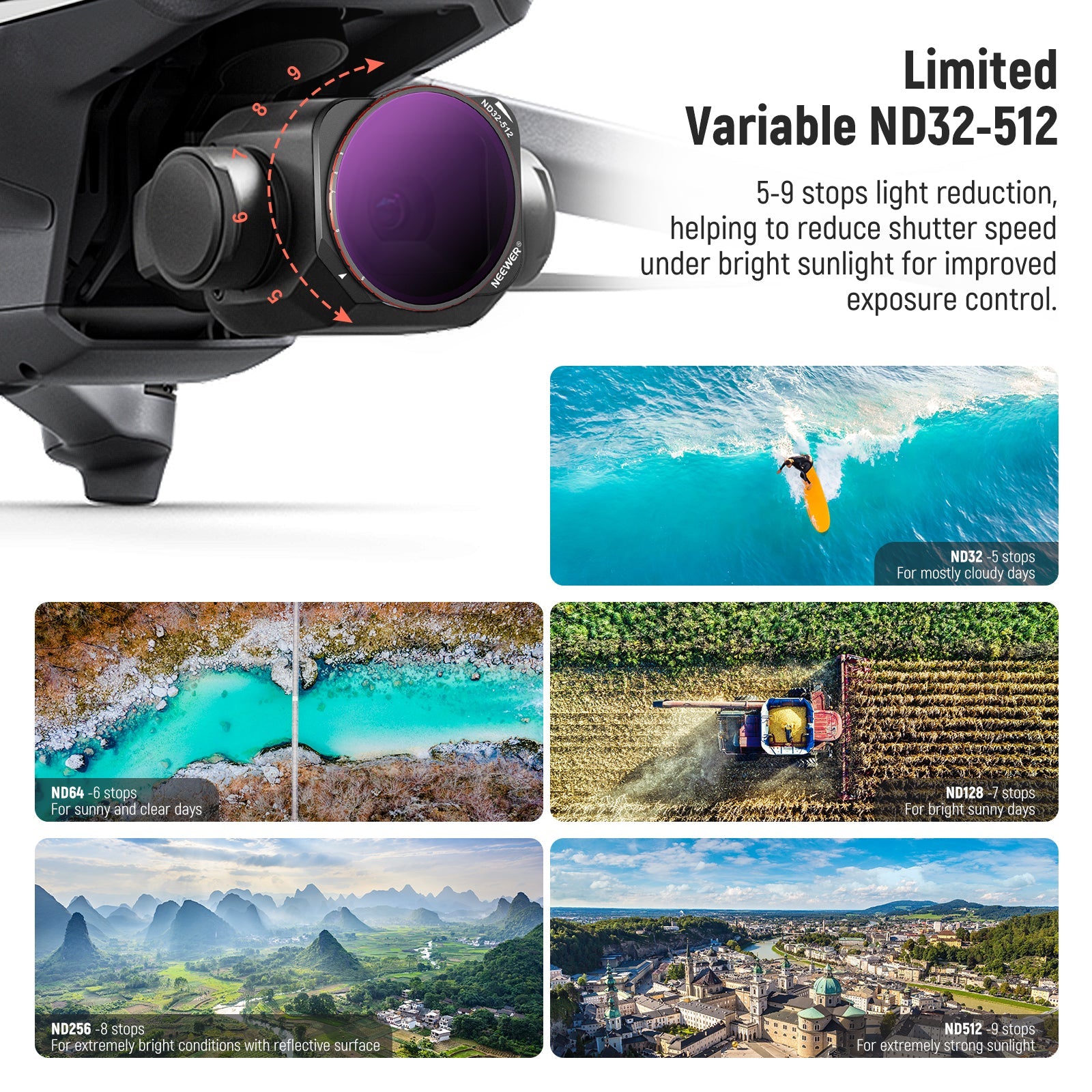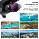 - Budget Friendly & Time Saving VND Filters- The two filters, ND2-32 and ND32-512, cover 1-9 ND stops that would traditionally require 9 separate ND filters with specific stop values. Simply mount the filter on your drone lens and rotate the filter ring to adjust the amount of light entering your camera lens, preventing overexposure and providing a time-saving solution for dealing with various light conditions