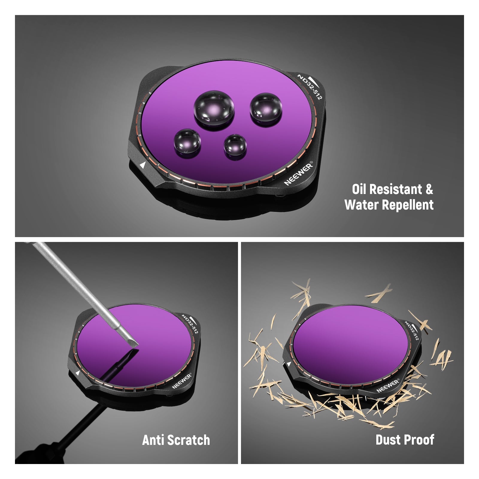 - 1-9 Limited Stops of Light Reduction- With F stops clearly marked on the filter frame, the ND2-32 and ND32-512 neutral density filters provide 1 to 9 stops of light reduction to achieve balanced exposure across images, reduce shutter speed for long exposure shots, and apply wider aperture for shallower depth of field. Apply ND2-32 for partly cloudy and sunny days, and use ND32-512 for extremely bright conditions