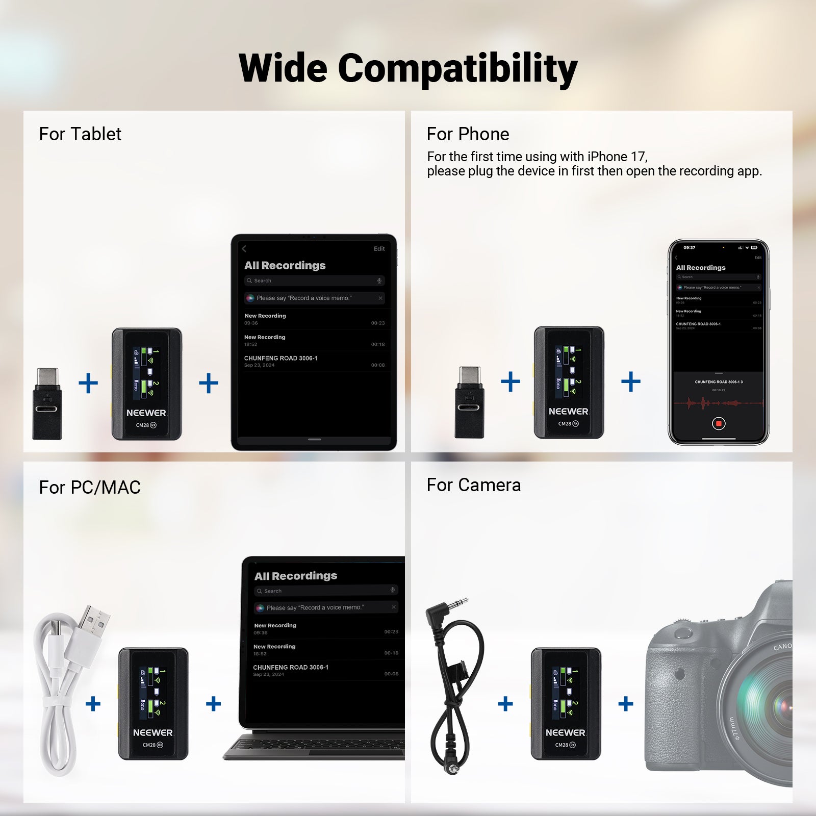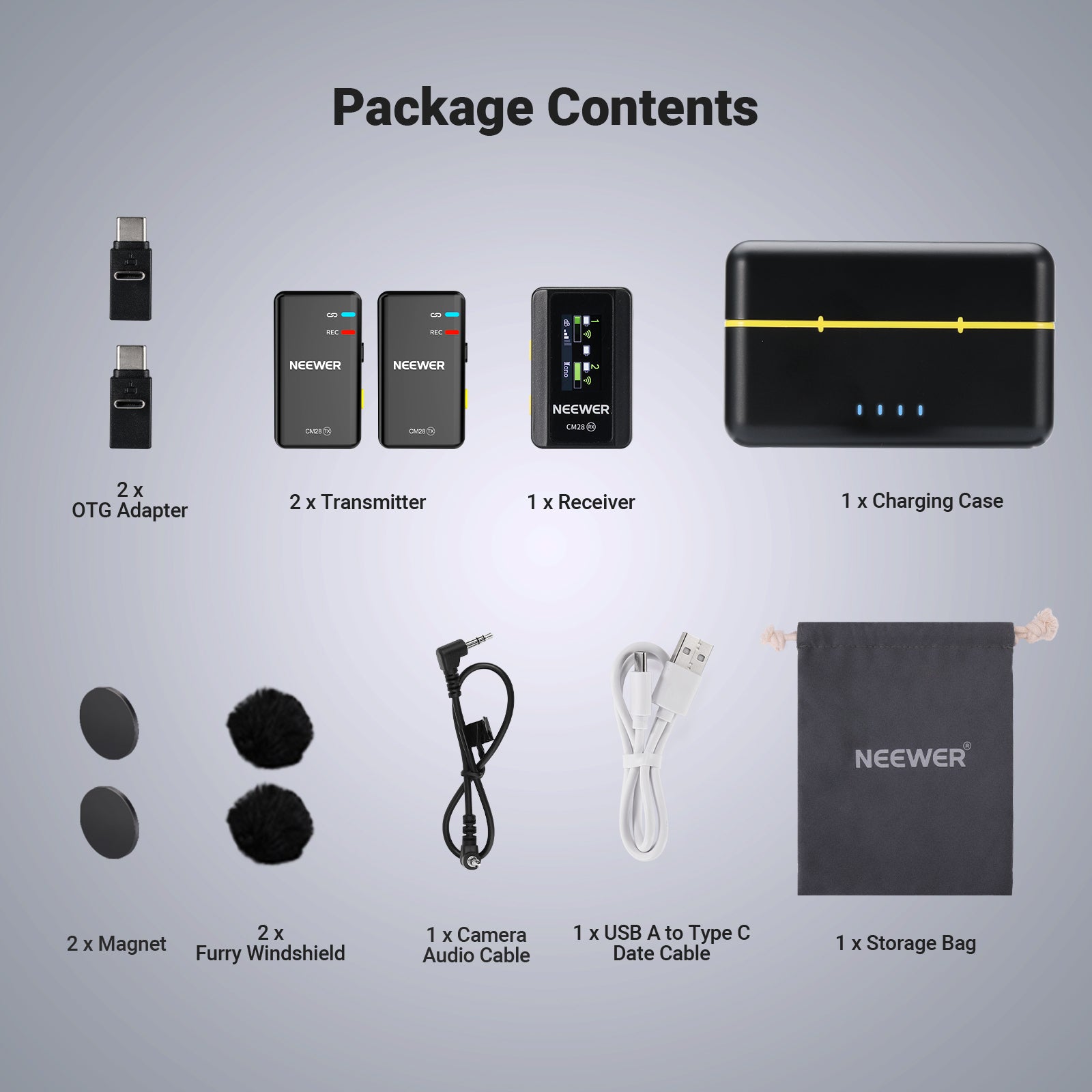 - Professional Wireless Lavalier Mic Set for Camera- NEEWER CM28 is a mini Wireless lapel Microphone Set with 2 transmitters (TX) and 1 receiver (RX). They can operate for 9 hours (TX) and 8 hours (RX) once fully charged, ideal for extended outdoor audio recording, podcasting, and live streaming. Charge them twice in just 1.5 hours each time with the included protective charging case.