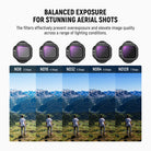 - Flexible Exposure Control- ND8, ND16, ND32, ND64 neutral density filters reduce light by 3, 4, 5, 6 stops respectively to prevent overexposure in different conditions and let you capture rivers, waterfalls, and light trails with dynamic motion blur