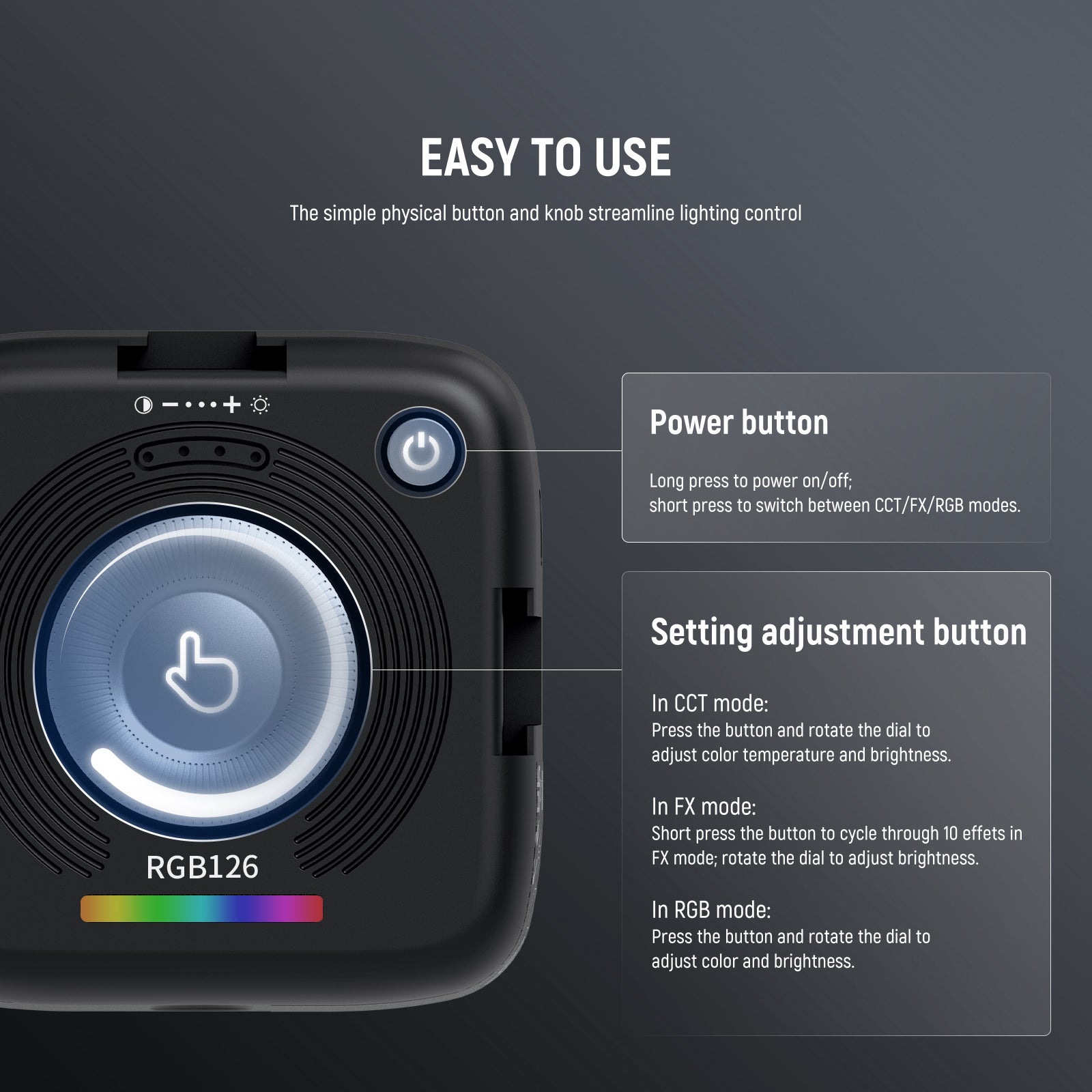 - Compact & Portable Camera Light- The RGB126 is a pocket sized mini LED fill cube panel light for cameras photography, measuring 3"x3"x1.4"/76x76x35mm, weighing only 3.8oz/108g with the diffuser. Also can be clamped on a laptop, or magnetically attached to capture beautiful moments as a key or fill light. The simple physical button and knob streamline lighting control, essential gear and must have selfie light for social media content creators, makeup artists, live streamers, and influencers