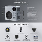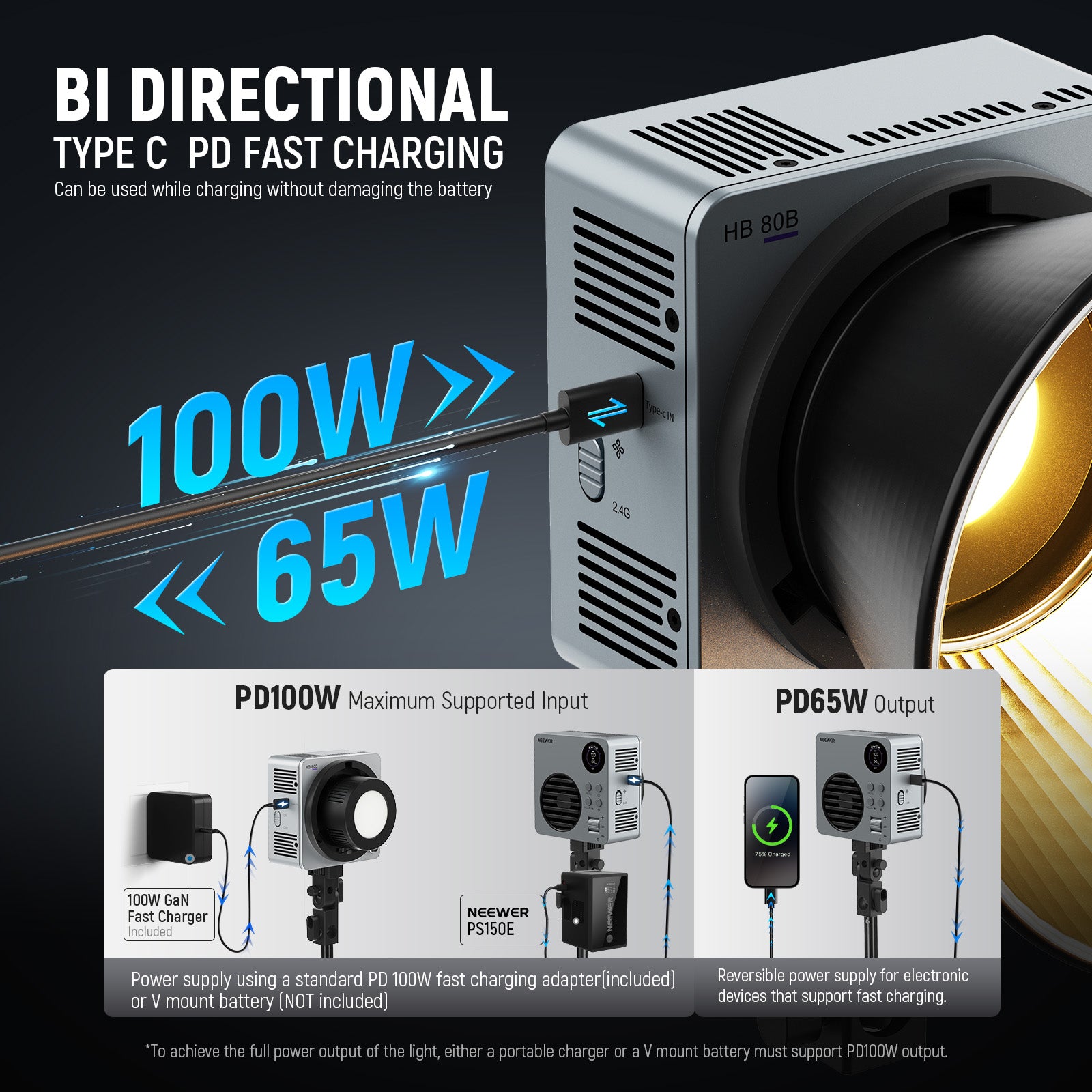 - 3 Fan Modes & Type C PD Fast Charging- The cooling fan has 3 modes: Mute (5W)/Regular (60W)/Booster (80W). Mute mode lasts approx. 1h 34min, Regular mode lasts 1h 14min at 100% brightness, Booster mode requires a PD100W adapter (NOT Included). The type C bidirectional port supports max PD 100W input and PD 60W output, allowing for a full charge in 2 hours when powered by a PD 60W or higher input. You can use the light while charging without damaging the battery