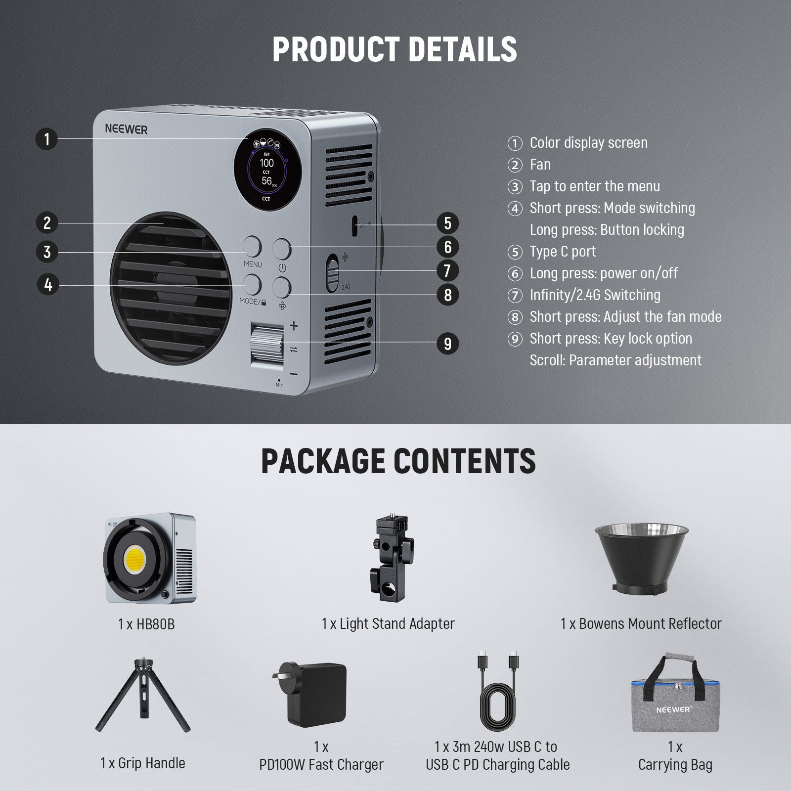 - Infinity App/2.4G Control- The built in NEEWER Infinity technology supports both App control and 2.4G wireless communication to achieve master slave functionality. When set to the same channel (00-99), the HB80B can synchronize with other 2.4G NEEWER lights, facilitating convenient and efficient group control