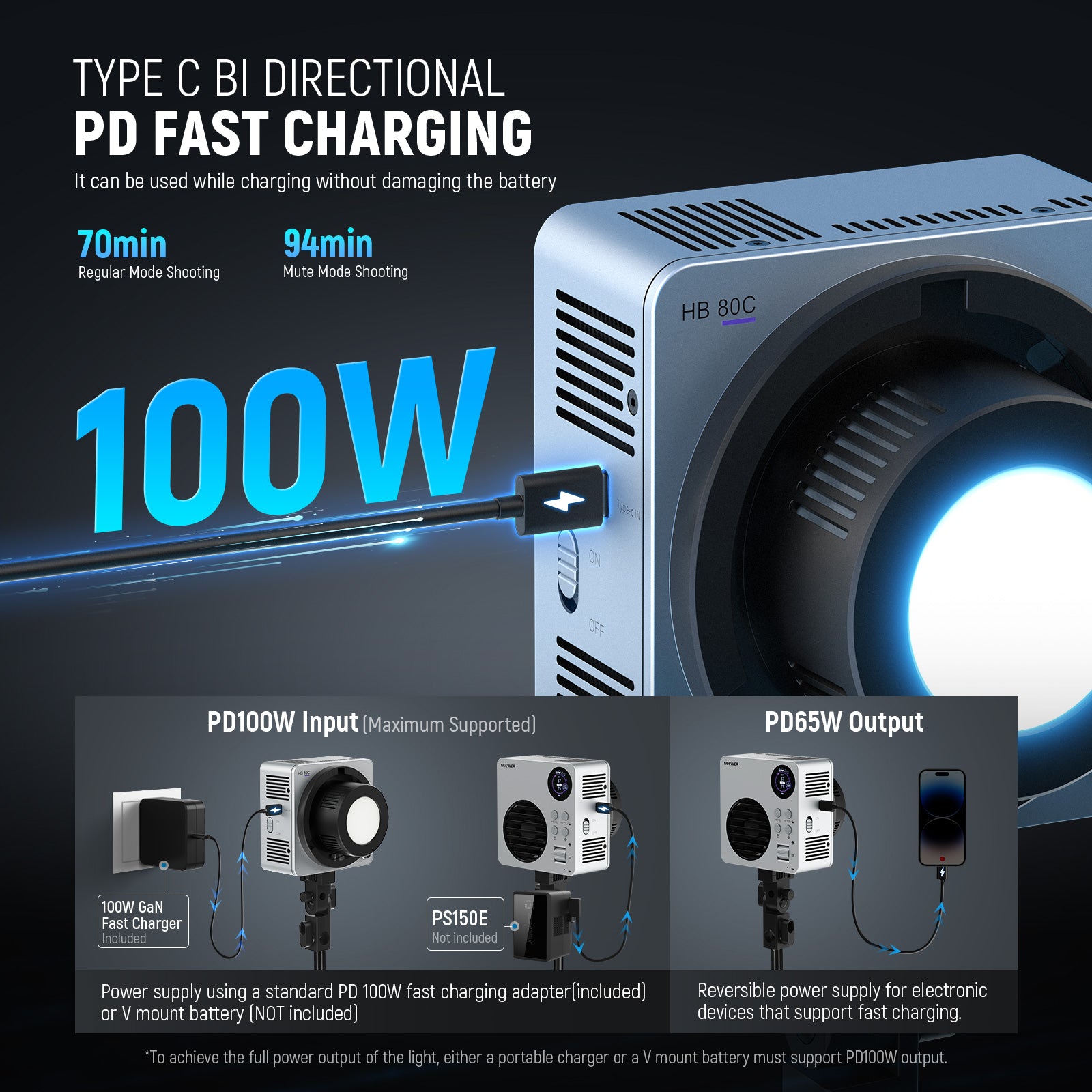 - Built in 72Wh Battery RGB COB LED Light- HB80C is a 80W high power mini RGB light, with threaded mixing cavity can make RGB color more uniform, 2500K-7500K wide color temperature range, GM ± 50 adjustable, color rendering index 95+, color temperature 4400k booster mode of illumination of the bare lamp 3720lux / m, with Reflector illuminance 10400lux/m, 0-100% brightness adjustment range, The maximum battery life is 70 minutes at full power and 95 minutes in mute mode.