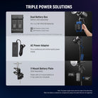 - Multiple Power Supplies Supported- Including a battery plate, MS60B can run on one or two batteries and illuminate anywhere. Not only is it compatible with the NP-F750 and NP-F970 batteries, but it can also be powered from a V mount battery (14.4V) using a D Tap cable (both batteries and D Tap cable not included). The AC power adapter lets you connect the light to a wall socket for uninterrupted operation. Note: Batteries