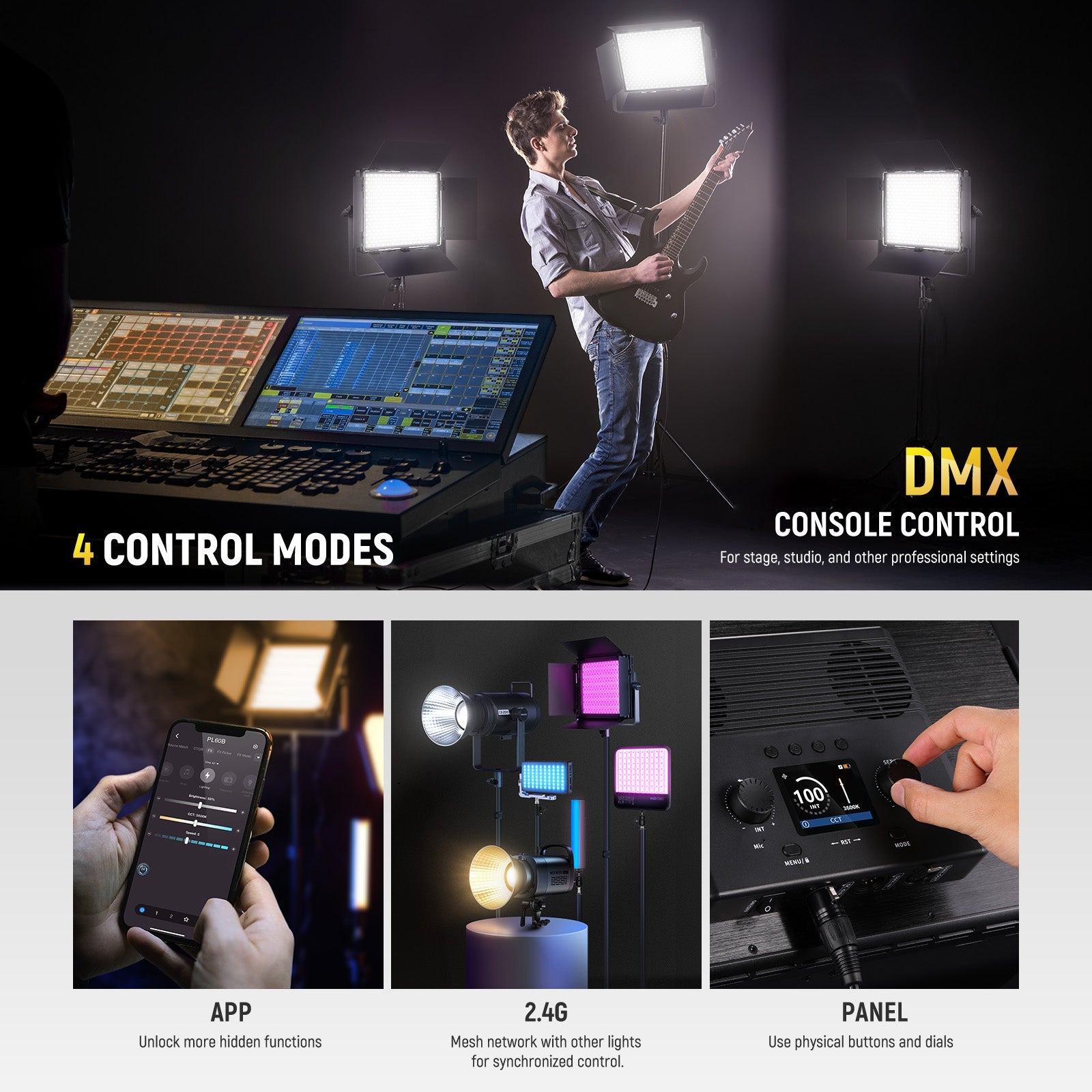 - APP/2.4G/Panel/DMX Control- 4 control methods to meet both the pro and novice. The NEEWER APP enables wireless control and multi light group management; the built in 2.4G module achieves master slave control with different light models (AP150C, PL60C, FS300C, FS150C, RGB2, RGB1200, MS60C, MC60B, MS150B, FS150B, BH30S, CB60B, etc.); the panel with a TFT color display showing intuitive parameters is easy to operate; A 5 pin DMX port can connect to a DMX console for complicated multi light setups