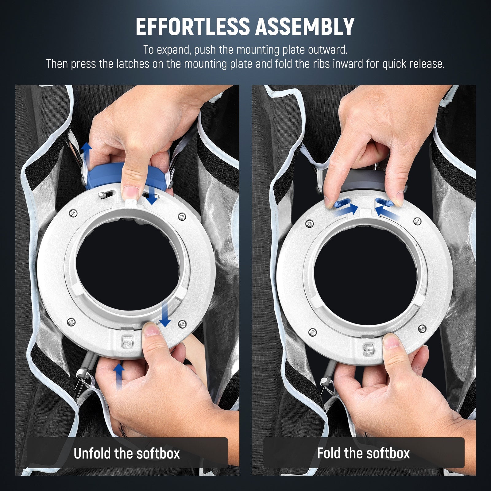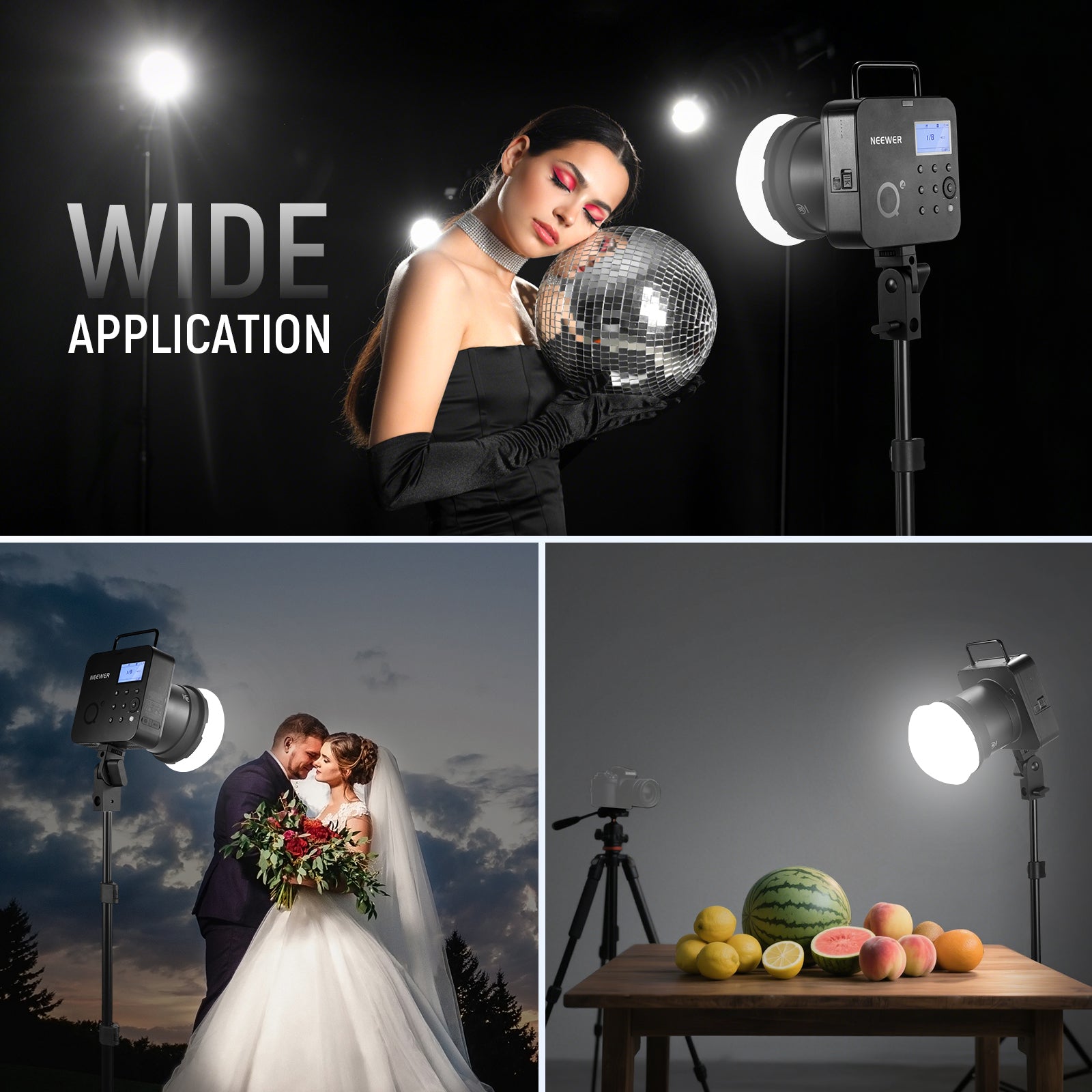 - 400Ws New Look Powerful Versatile Strobe- Q4 400Ws flash moonlight features a compact rectangle shape with rounded corners measuring 7.28"x6.06"x8.35"/18.5x15.4x21.2cm. Weighing 4.94lb/2.24kg, it offers space-saving portability while remaining compatible with Bowen-mounted accessories. With its impressive GN72 with a high-performance reflector (not included), 30W/5600K/CRI95+ LED modeling lamp, and convenient top handle, it meets the various needs of users shooting outdoors
