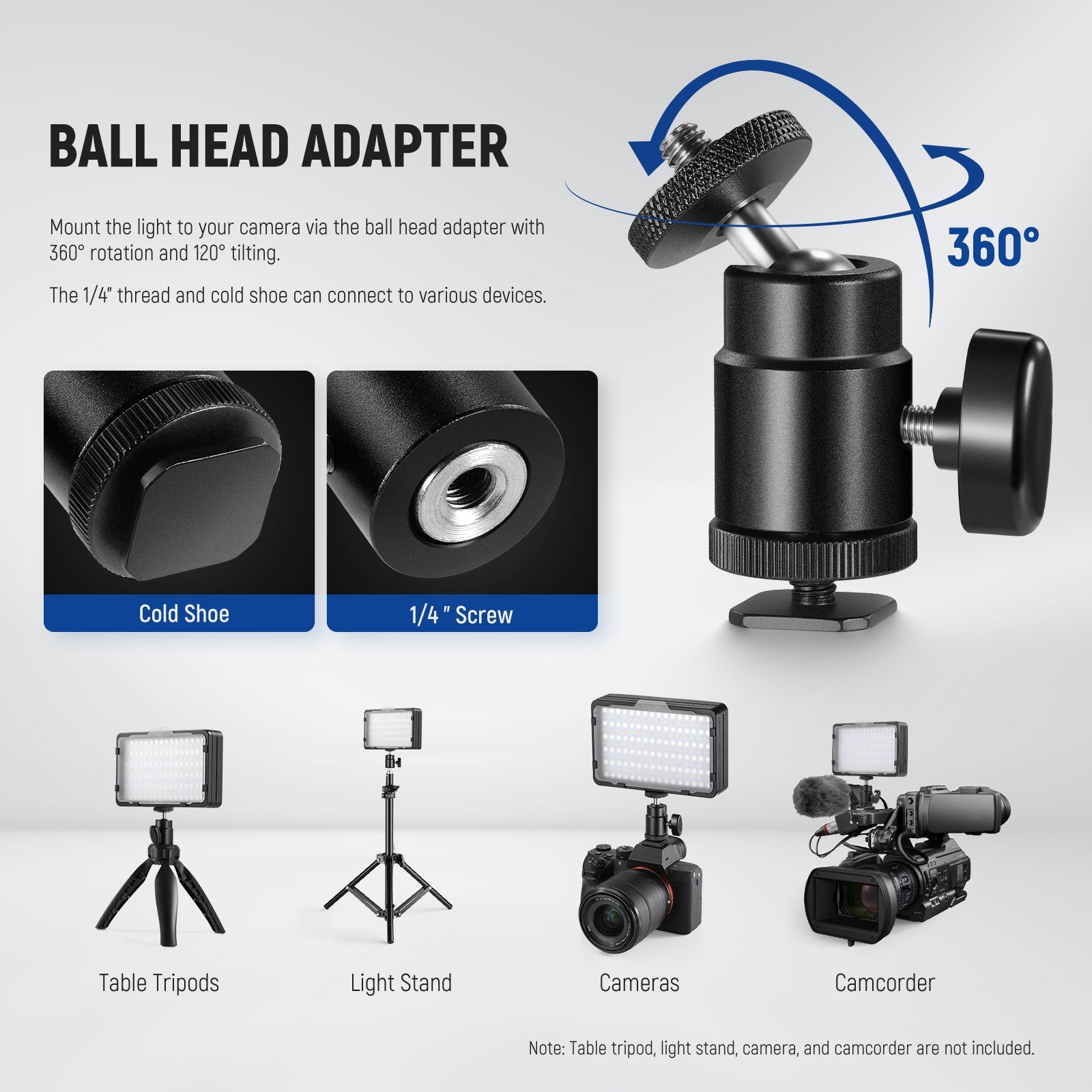 - 360° Swivel Cold Shoe Ball Head- As a compact and lightweight light, it can mount on your DSLR camera via the cold shoe ball head adapter and swivel 360° or tilt 120° for any lighting angle. The 1/4" thread hole can connect the light to a light stand or desktop stand as well