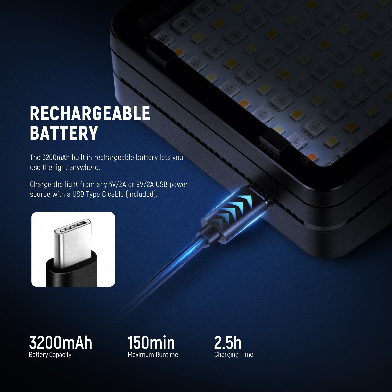- Built in 3200mAh Rechargeable Battery- Say goodbye to spare batteries. The built in 3200mAh rechargeable battery (7.4V/23.68Wh) provides cordless power and stable lighting no matter where your project takes place—be it outdoor photography, travel vlogging, or videography for TikTok/YouTube. Use the included USB Type C cable to charge the light from a wall charger with 5V/2A or 9V/2A output