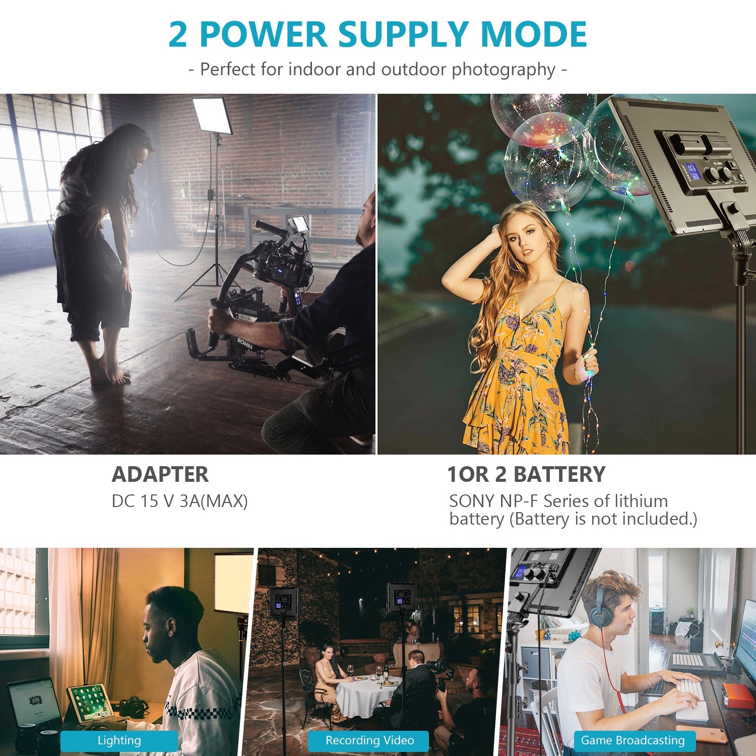- Easy to Use- Easily install the light on any tripod or lighting stand. Adjust the lighting angle to wherever you want using the adapter. And the LCD display and knobs on the back panel are extremely convenient for monitoring color temperature, lighting brightness, and power status.