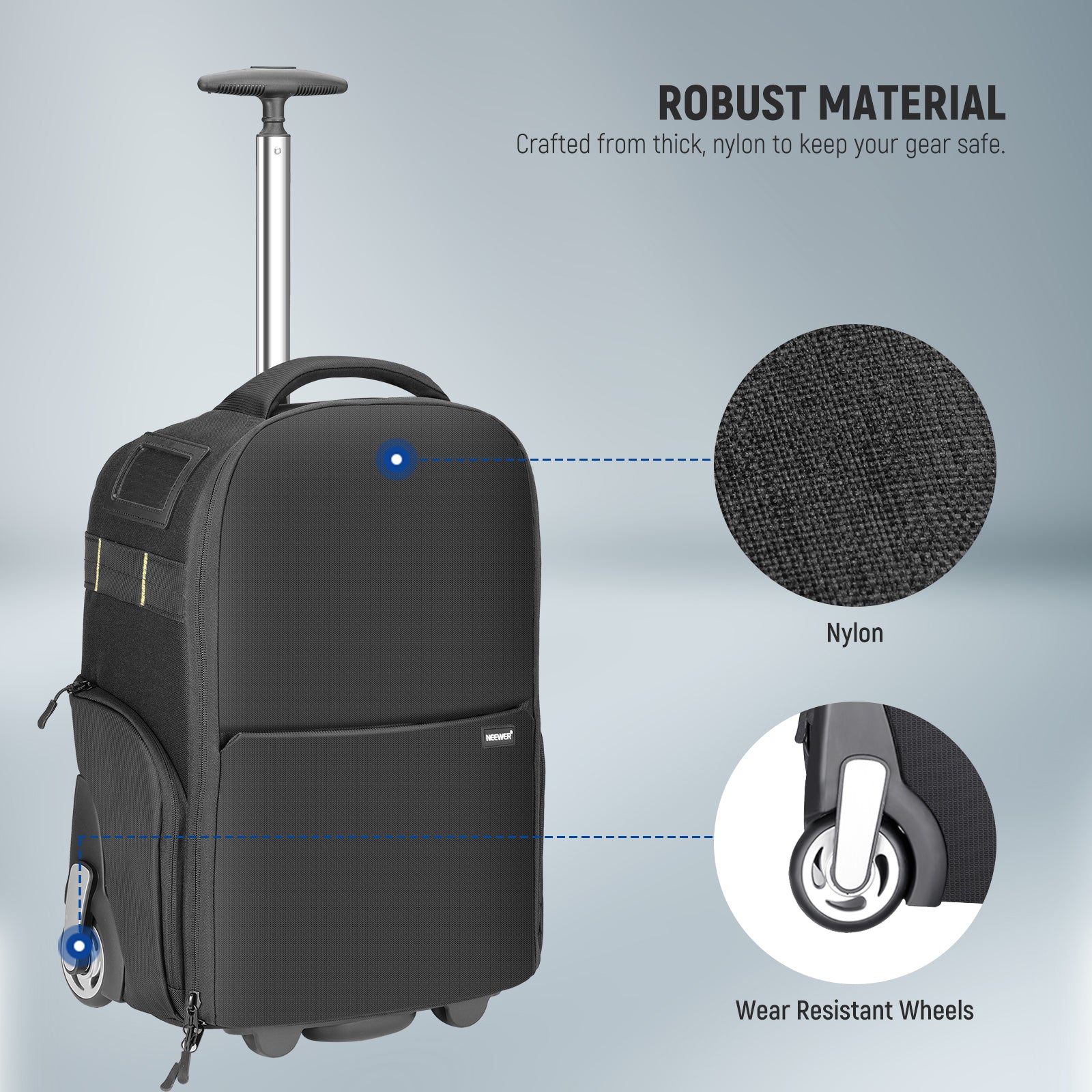 - Large size accommodates loads of photography equipment and rollerblade-quality wheels ensure effortless mobility, whether it's through airport terminals, across uneven terrain to remote photo shoots.