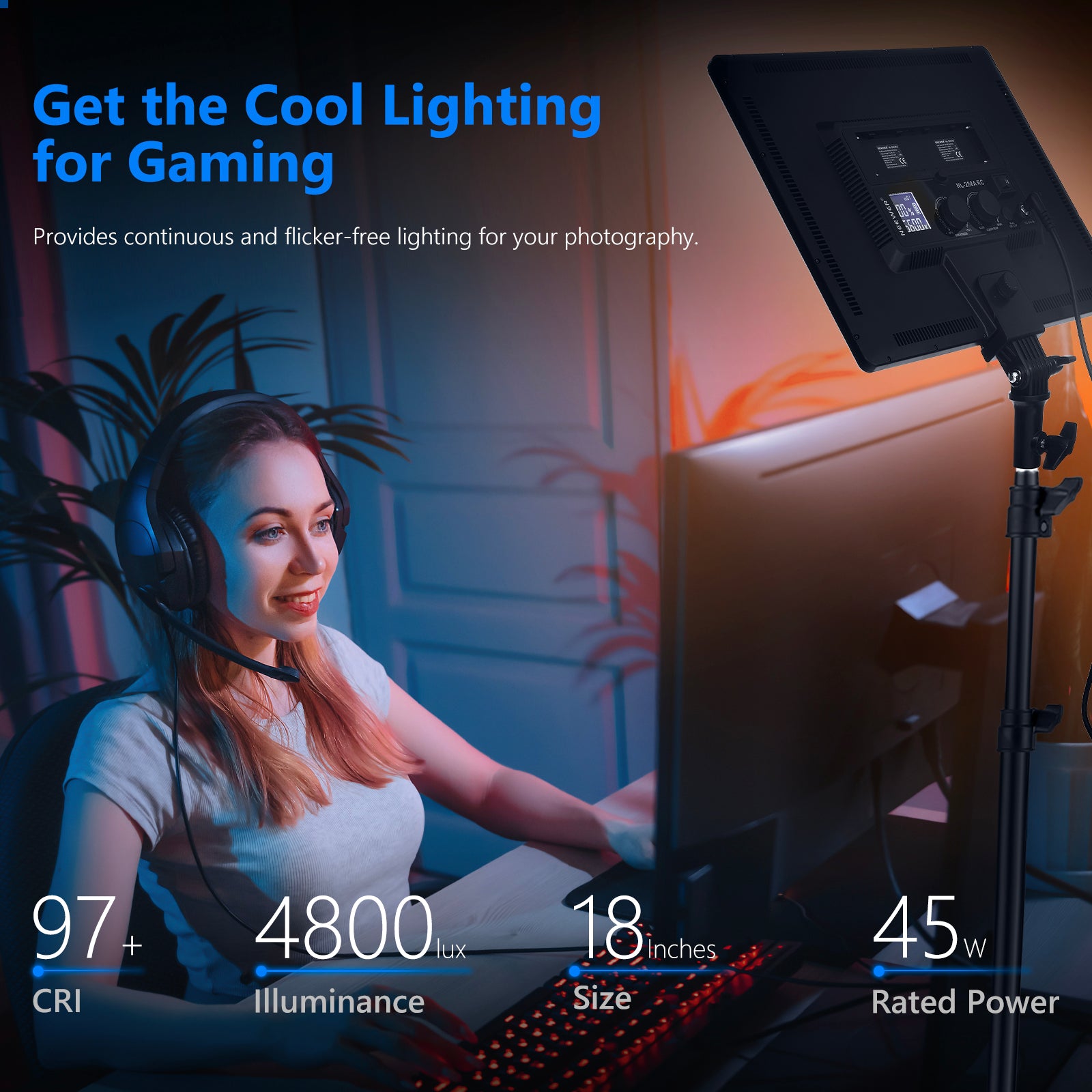 - Ultra Bright Led Video Light- Super high-power 45W Bi-color LED light, composed of LED 288 lamp beads (144 White and 144 Yellow); CRI 97+ High; Luminance is up to 4800lux@0.5m, 1400lux@1m; 18inch super large light panel (120°beam angle); Soft light is perfect for Portrait/Children Photography, Youtube/Studio Video, Live Stream, Interview and Business photography