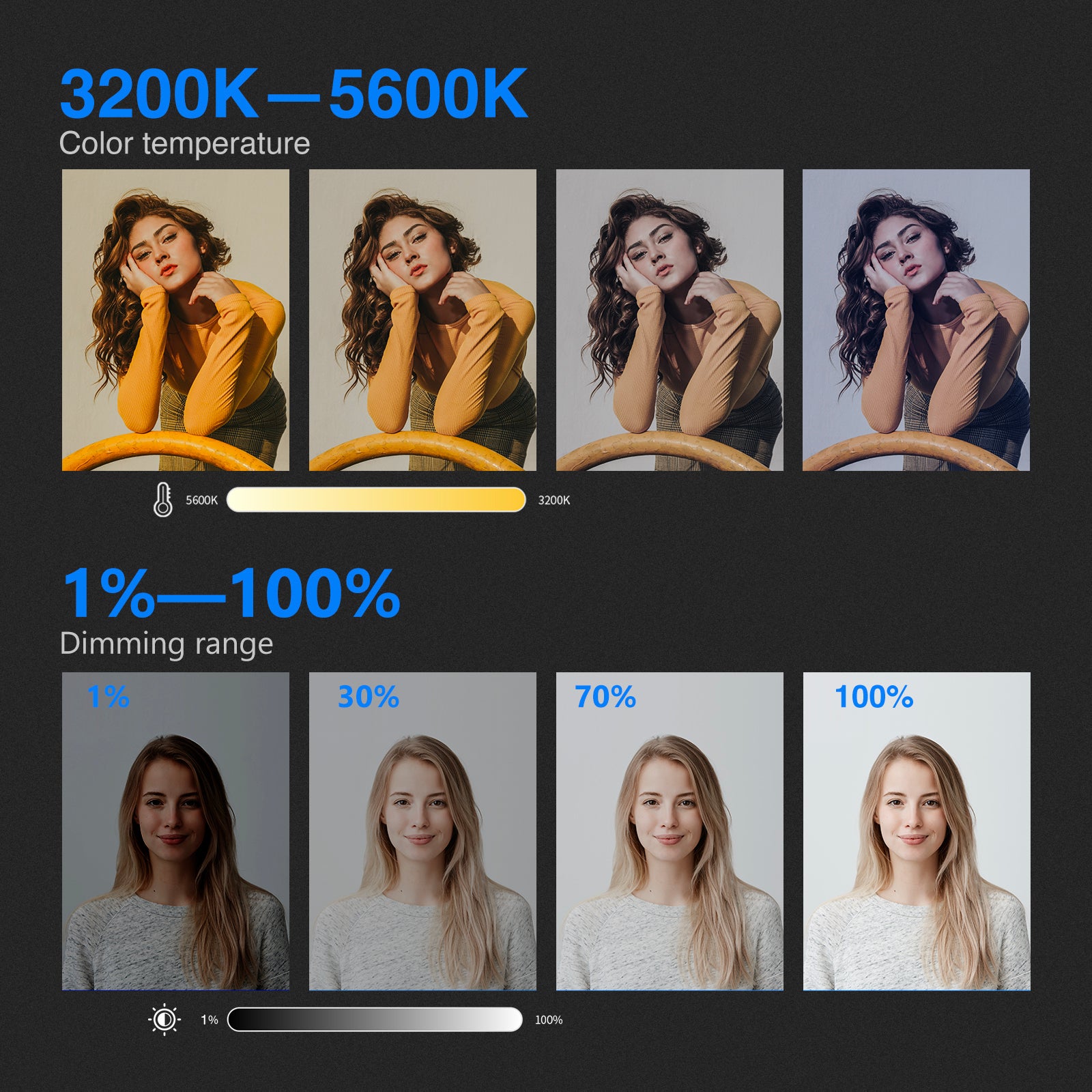 - Bi-Color & Dimmable Soft Light- Color temperature can be adjusted from 3200K(warm) to 5600K(white); Brightness can be adjusted from 1% to 100%; LCD screen clearly displays the parameters of brightness and color temperature, which helps you operate easily and work more efficiently via 2 knobs