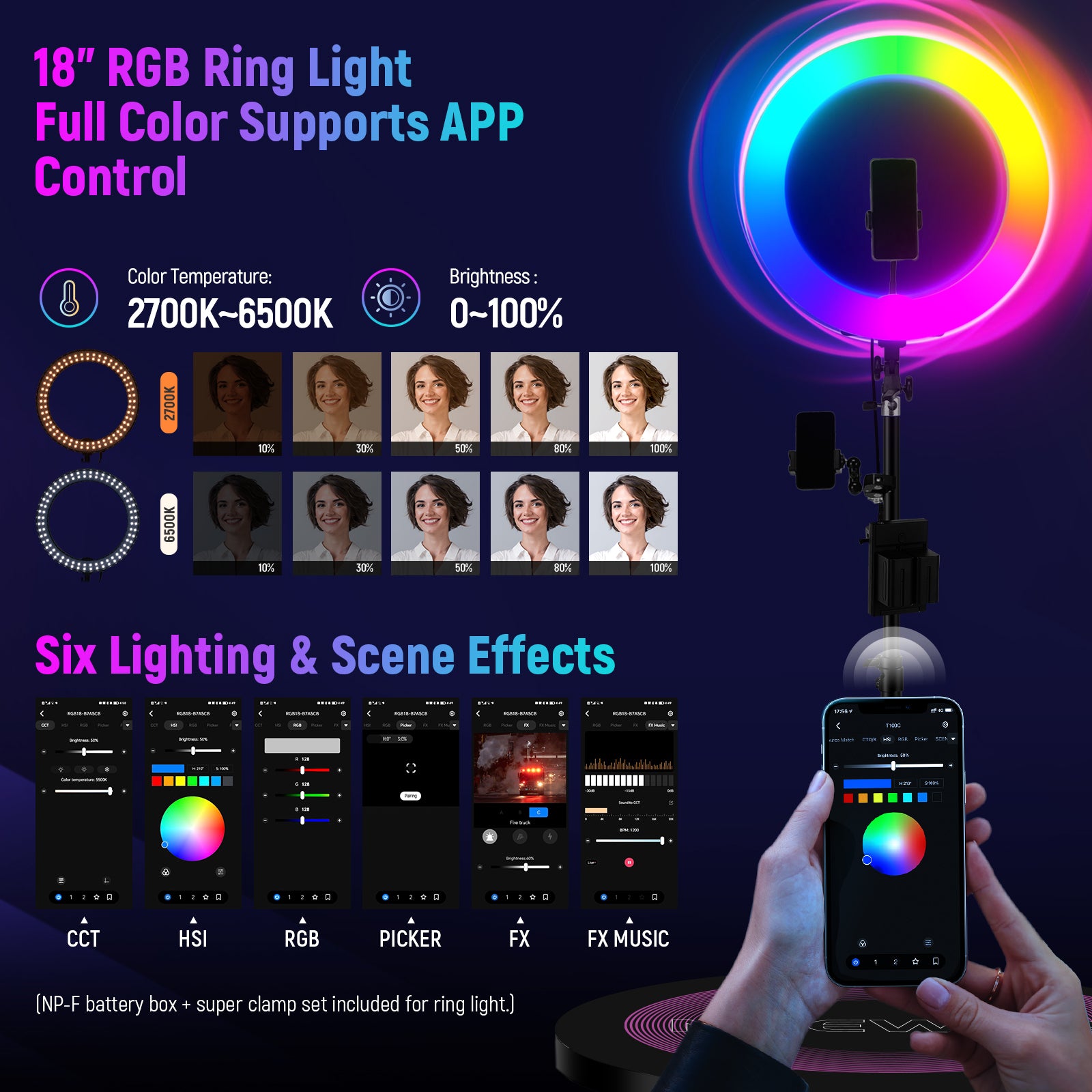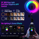 - 18" RGB Ring Light- The NEEWER RGB18 (II) features excellent 360° full color light with 180° adjustable tilt. It offers six dimming modes, including CCT/HSI/RGB/Picker/FX/FX Music, and supports preset scene light effects that sync with the music. With an adjustable color temperature range of 2500K to 10000K and a high CRI97+, it is perfect for multi person fill light needs. Bluetooth remote control via the NEEWER app enhances its usability