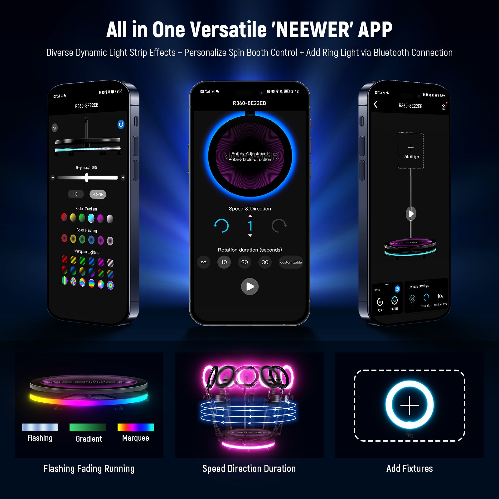 - Smart APP Control- Download the "NEEWER" app and connect via Bluetooth to the NEEWER R360 photo booth and the ring light for more functions. Easily control the light strip effects, 36,000 HSI light color combinations, and 30 preset light effects. Personalize rotating settings on your phone: select rotation direction, speed levels, and rotation times to achieve diverse shooting effects