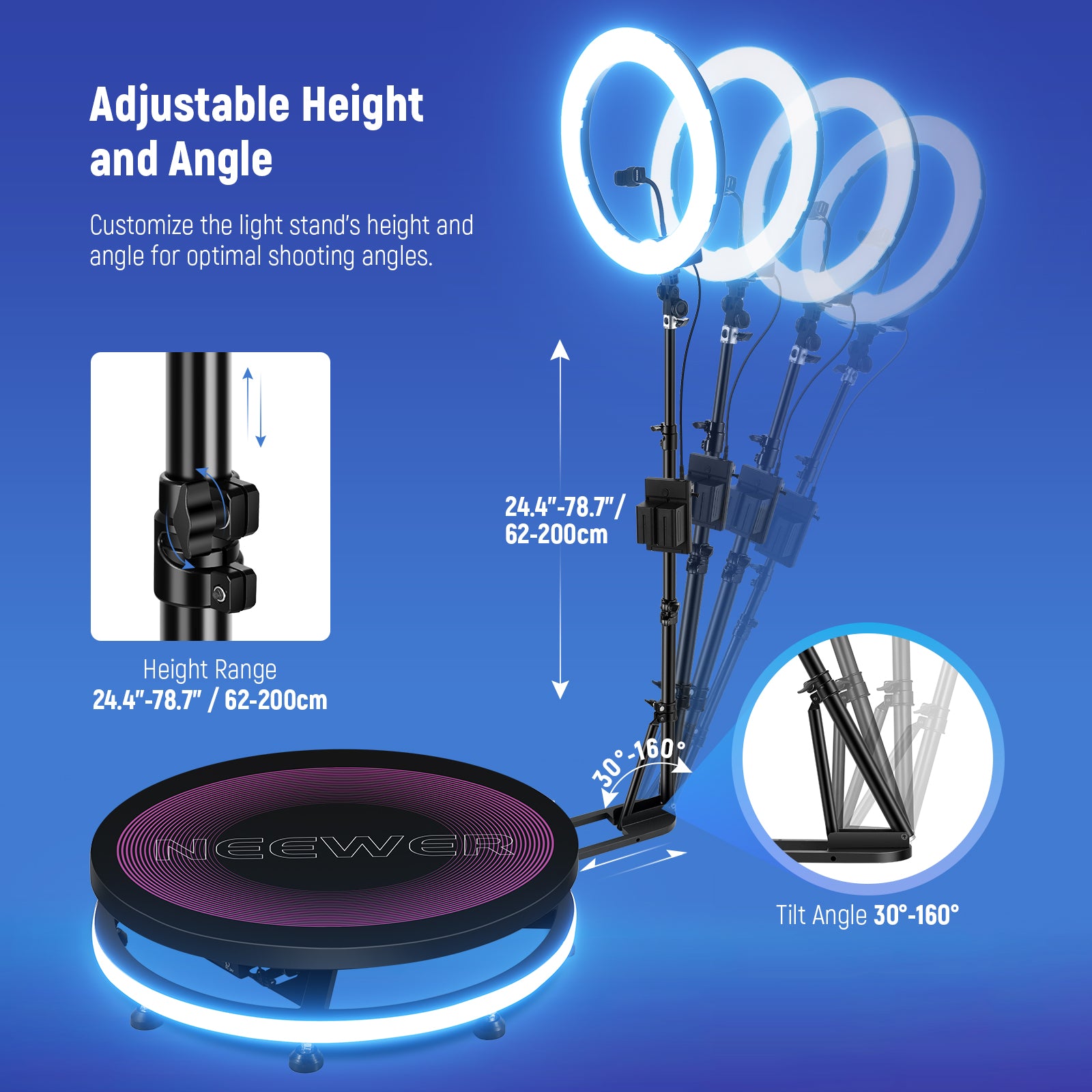 - Flexible Height & Multi Device Mounting- The light stand's height is adjustable in three sections (24.4”-78.7”/62-200cm) and allows for front and back angle adjustments. Paired with the ring light's 180° tilt, achieve effortless multiple-angle shooting. Use accessories like the included phone/tablet holders and super clamps for simultaneous multiple devices recording during short videos, live streaming, and content creation