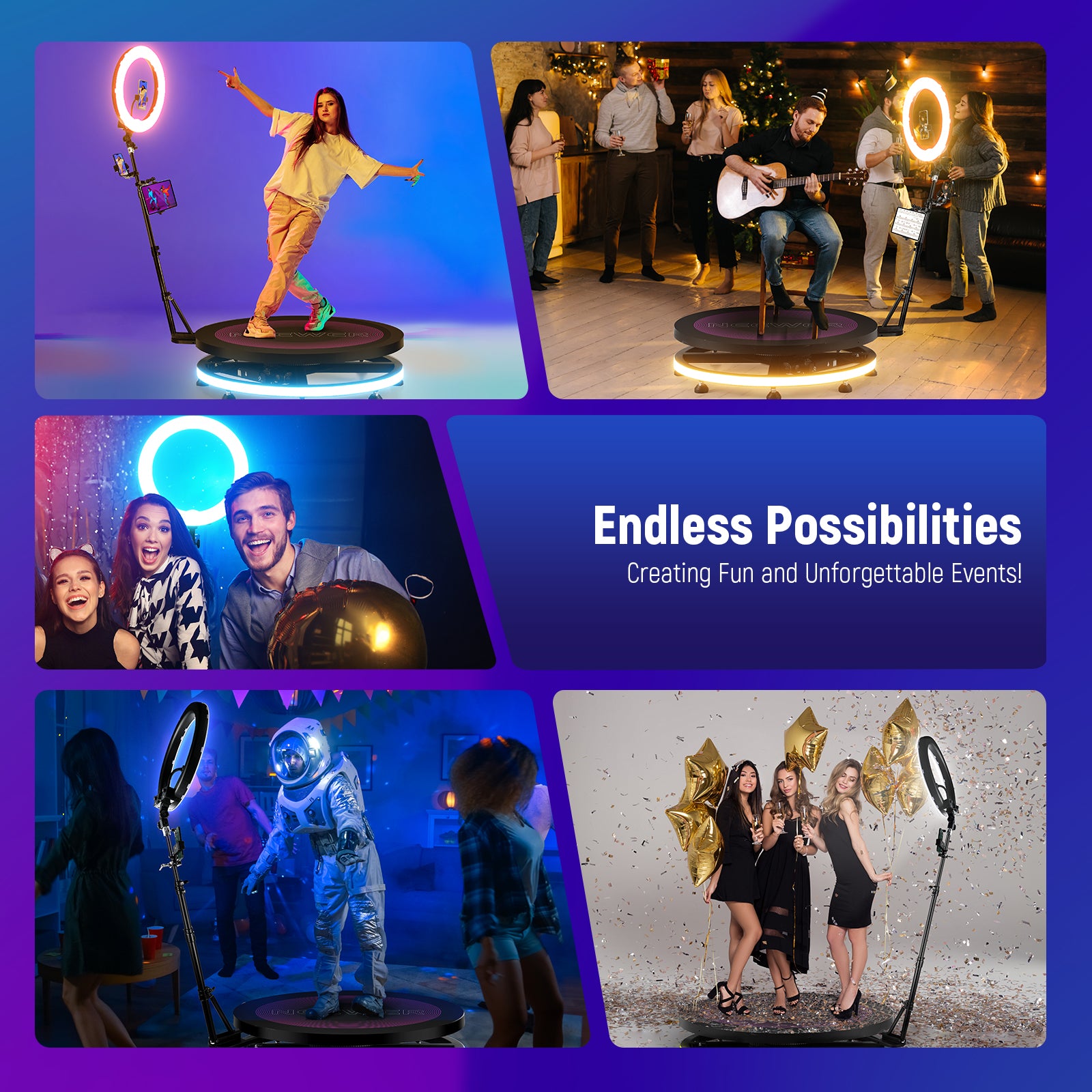 - 360° Panoramic Selfie Photo Booth- Introducing the NEEWER 360 Photo Booth Kit, an all in one solution for content creators and YouTube/TikTok streamers. It combines a 100cm/39.4" 360° Spin (customizable image cover), RGB LED strip, and RGB 18” ring light with APP control, and various accessories supporting multiple devices. Ideal for 360° shots, HD slow motion, GIF, and video for 1-3 people or objects, taking your artistic and commercial ventures to the next level