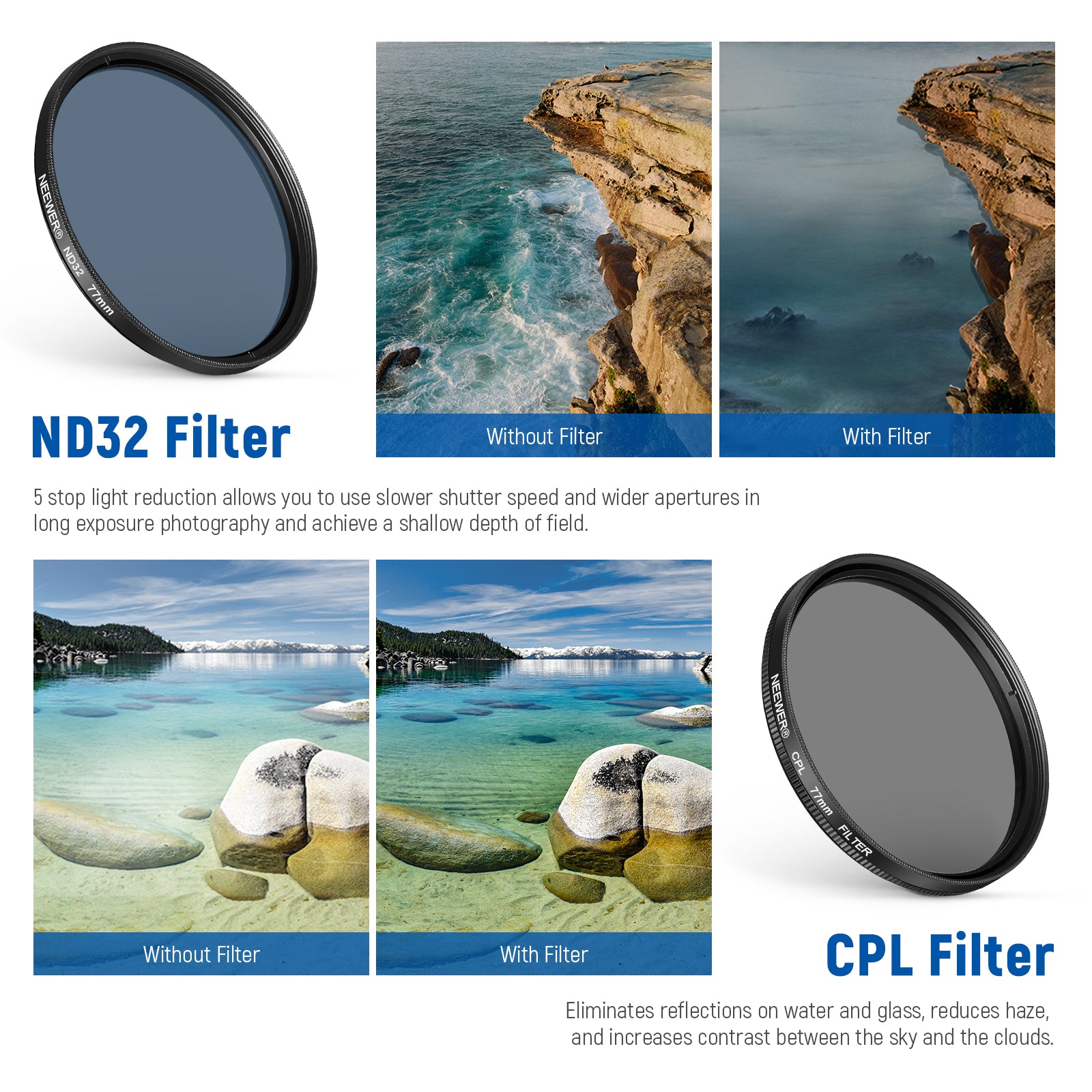 - Neutral Density Filter- The ND32 filter reduces 5 stops of light entering the camera sensor without changing the color. It allows you to use a slower shutter speed for creative photos or a wider aperture for shallower depth of field