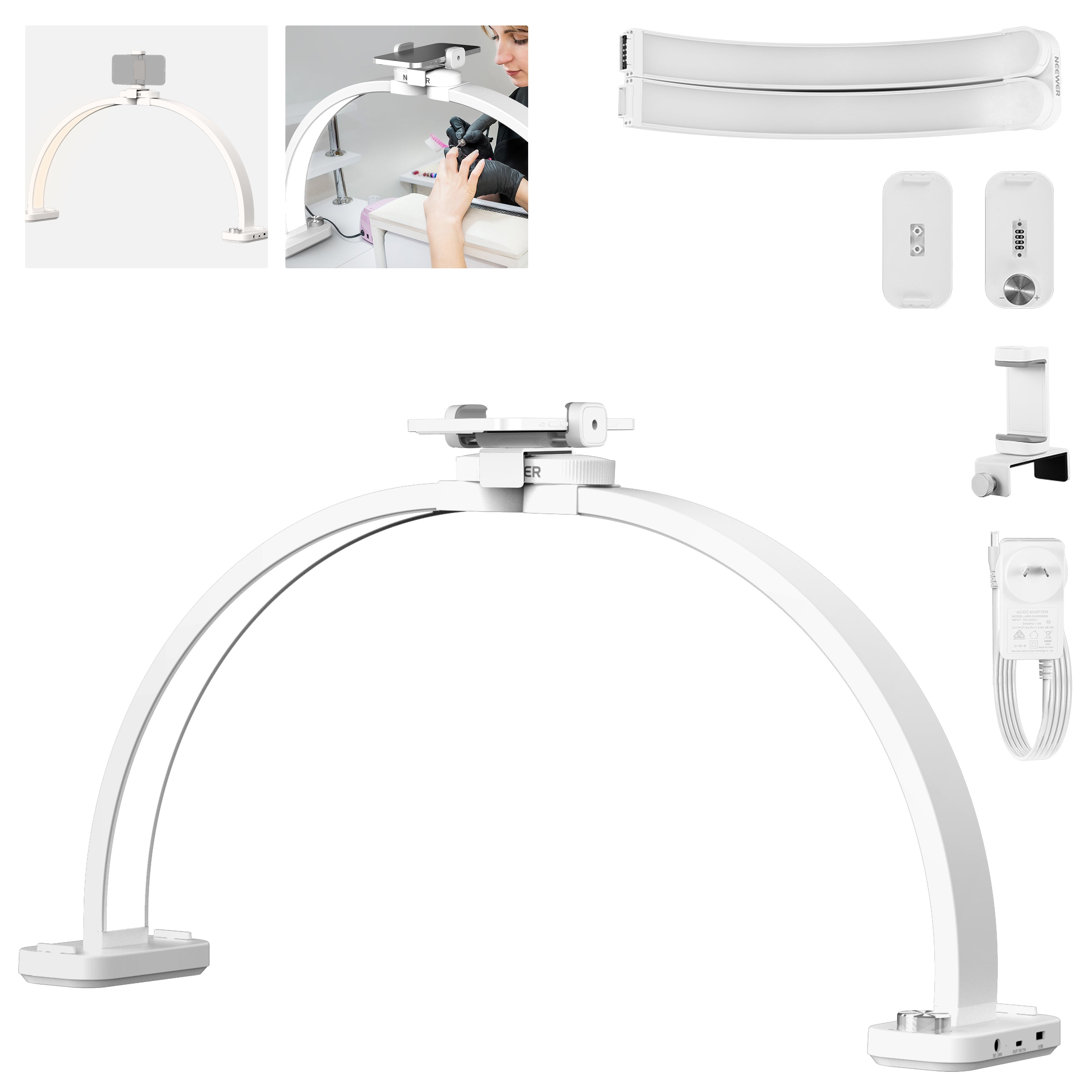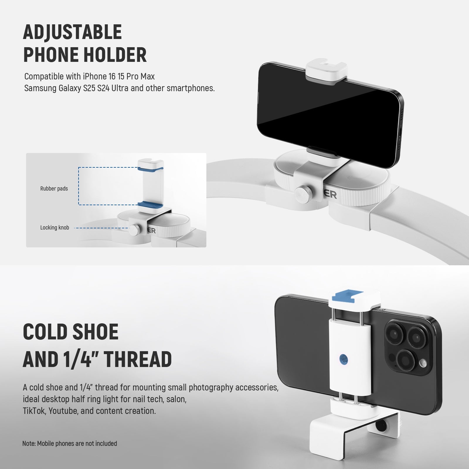 - Adjustable Phone Holder- The cell phone holder of this portable NEEWER LED half circle ring light for desk is compatible with iPhone 16 15 Pro Max Samsung Galaxy S25 S24 Ultra and other smartphones. It attaches to the lamp with a locking knob and features rubber pads to prevent any scratches. A cold shoe and 1/4" thread for mounting small photography accessories, ideal desktop half ringlight lighting for nail tech selfies, pictures, video recording for YouTube TikTok social media sharing
