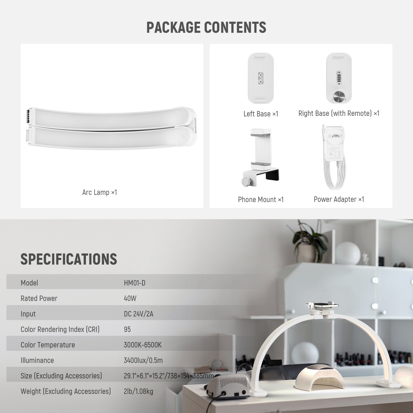 - Foldable 29" LED Arc Lamp- This dimmable, bi color 29" desktop LED manicure arm lamp for table offers a 40W power output, a 3000K-6500K color temperature range, 3400lux/0.5m max illuminance, and CRI 95 for accurate color reproduction. This desk half moon nail tech fill light’s foldable design allows for easy storage and transportation, perfect for makeup artists and content creators on the go