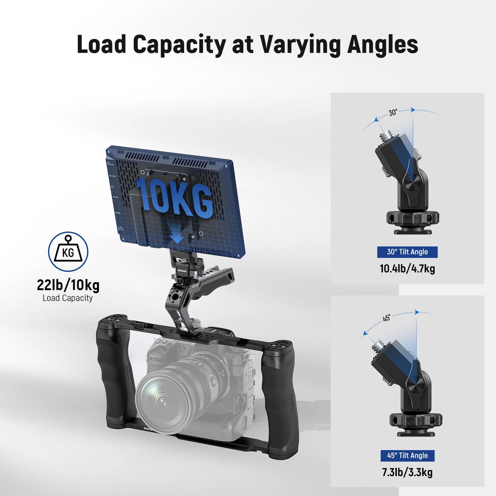- Solid & Lightweight- The camera cage (weight: 22.9oz/650g, max load: 33lb/15kg), top handle (weight: 5.1oz/145g, max load: 22lb/10kg), and monitor mount (weight: 1.9oz/55g, max load: 10.4lb/4.7kg at 30°; 7.3lb/3.3kg at 45°) are crafted from lightweight yet robust black anodized aluminum alloy, professional film stabilizer holder for video recording, filming, YouTube/TikTok vlogging, filmmaking indoors and out as content creator essential, video maker influencer must have equipment