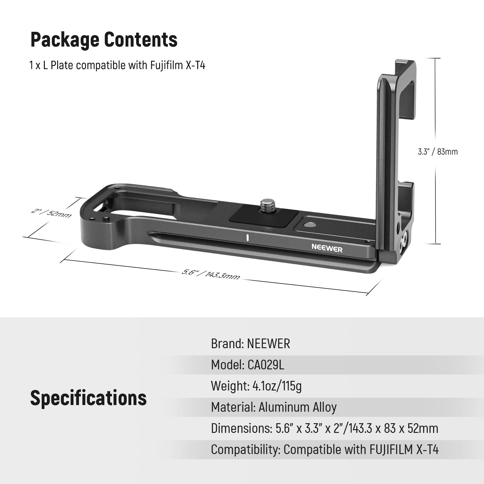 - Fully Compatible with Fujifilm X-T4- CA029L is a robust aluminum alloy L plate compatible with Fujifilm X-T4 mirrorless camera. Engineered with CNC precision machining, it protects the camera while ensuring full access to the function buttons, ports, card slots, battery compartment, and LCD screen