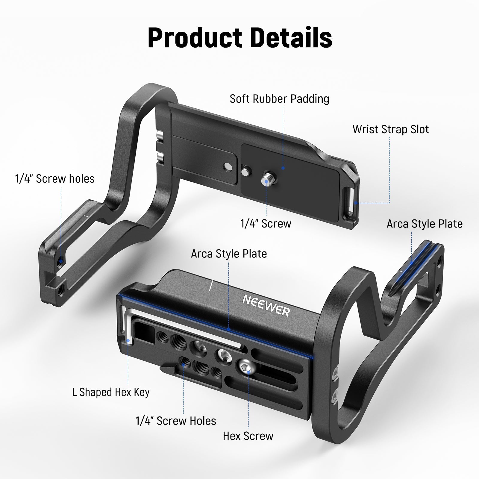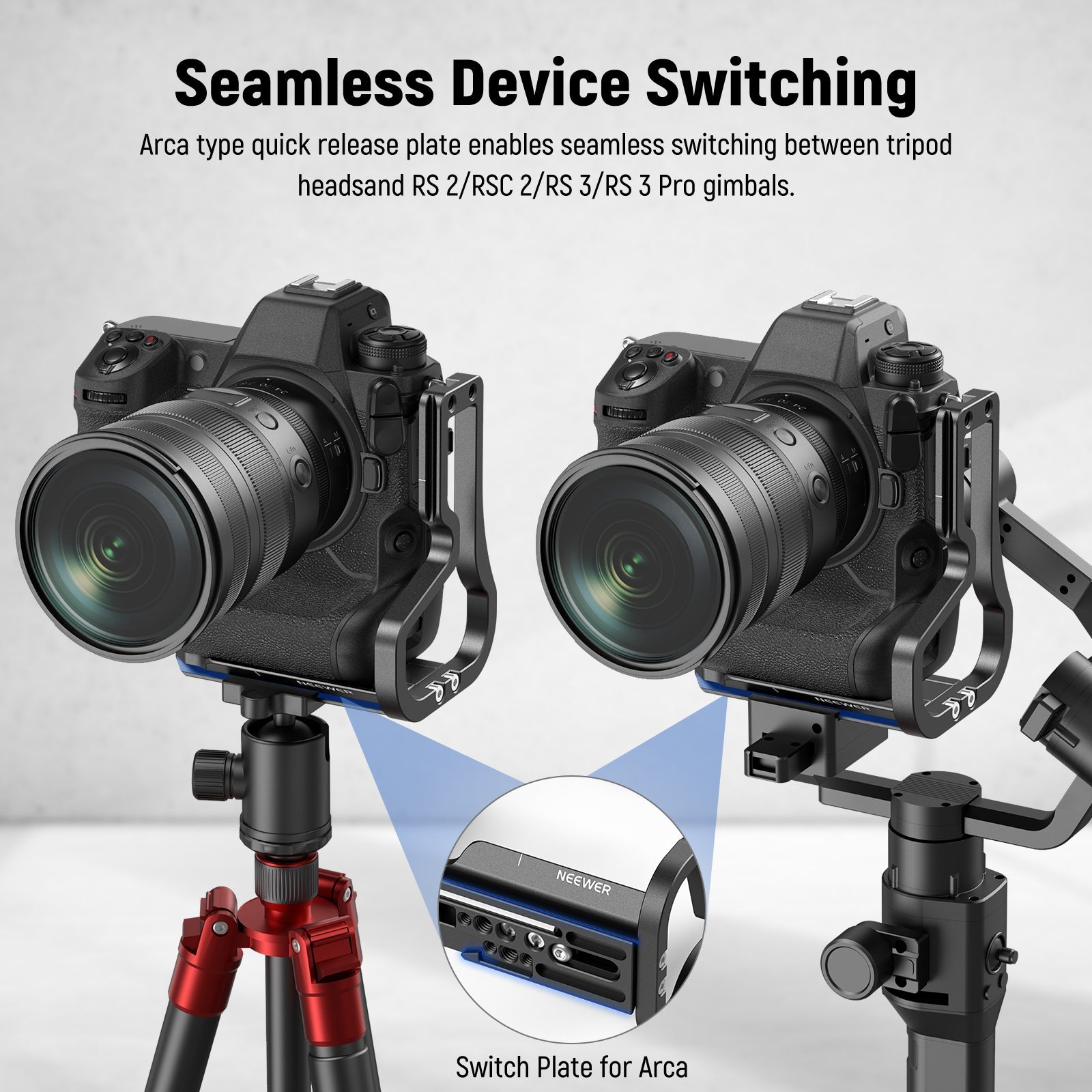 - Quick Equipment Switching- Dovetails on the side and base are compatible with the Arca quick-release system. So you can mount your camera vertically or horizontally on any Arca type tripod head, fluid head, or stabilizer and quickly switch them For RS 2/RSC 2/RS 3/RS 3 Stabilizers- The base of this L plate is compatible with DJI RS 2, RSC 2, RS 3, and RS 3 Pro stabilizers with an anti sliding design to prevent sliding off. There is a wrist strap slot for tying lanyards (not included) and a 1/4" and 3/8" thread for attaching to the NEEWER SR001 Base Plate (sold separately)