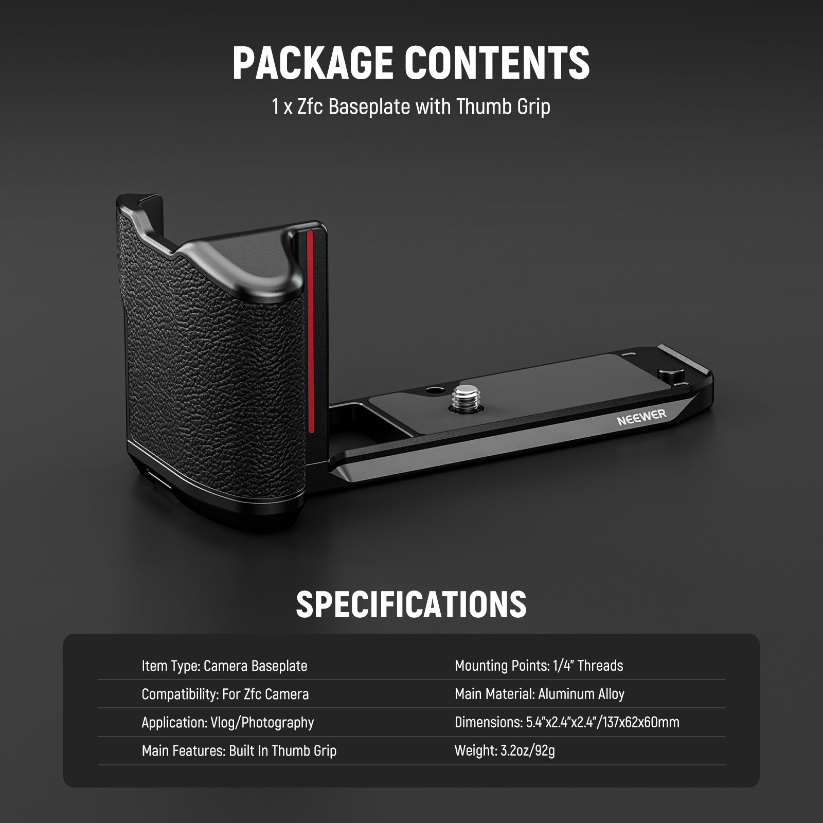 - Compatible with Nikon Zfc- Compatible with Nikon Z fc camera, this retro baseplate is an homage to the classic film camera era. It attaches to the camera via a 1/4" screw and keeps the battery compartment and other buttons fully accessible