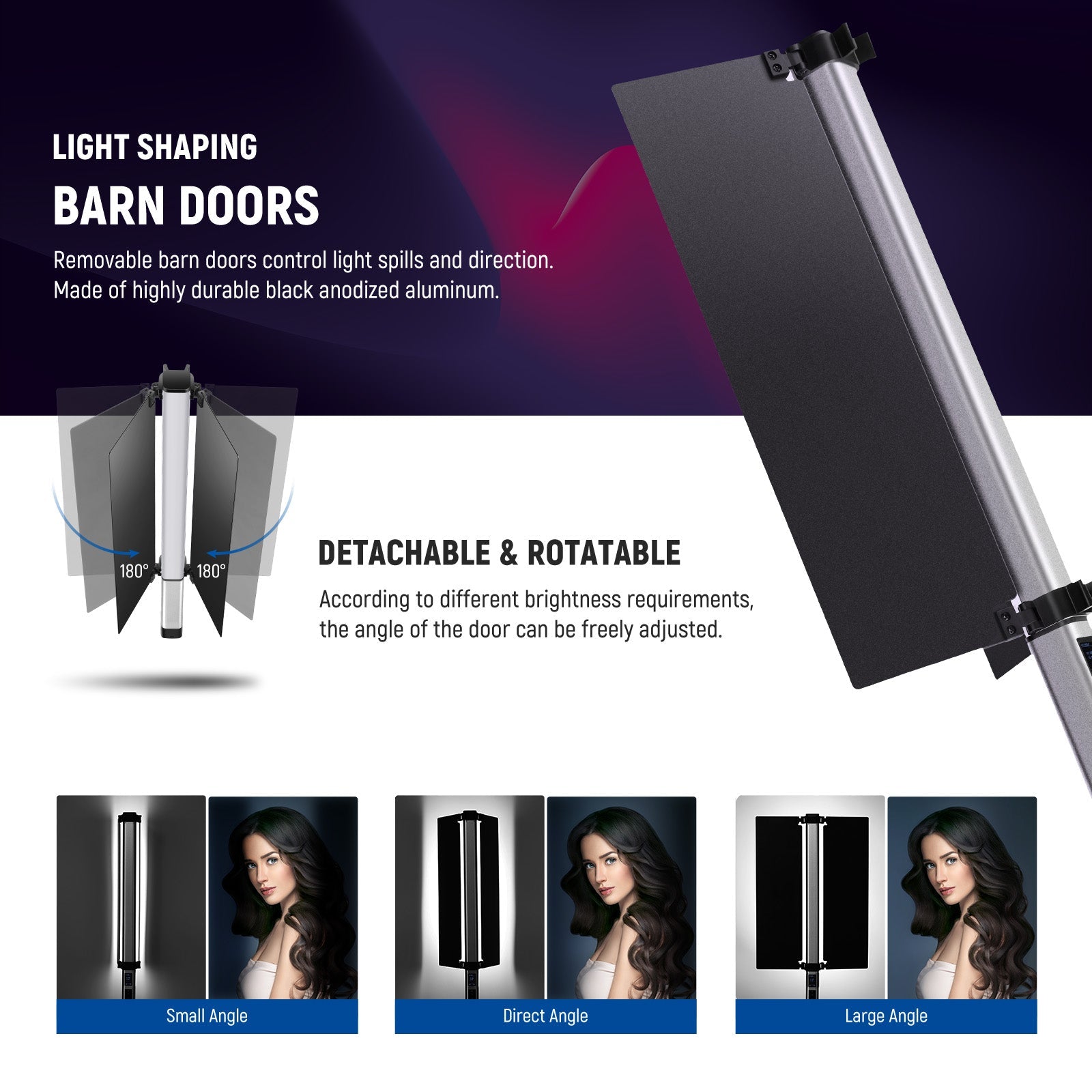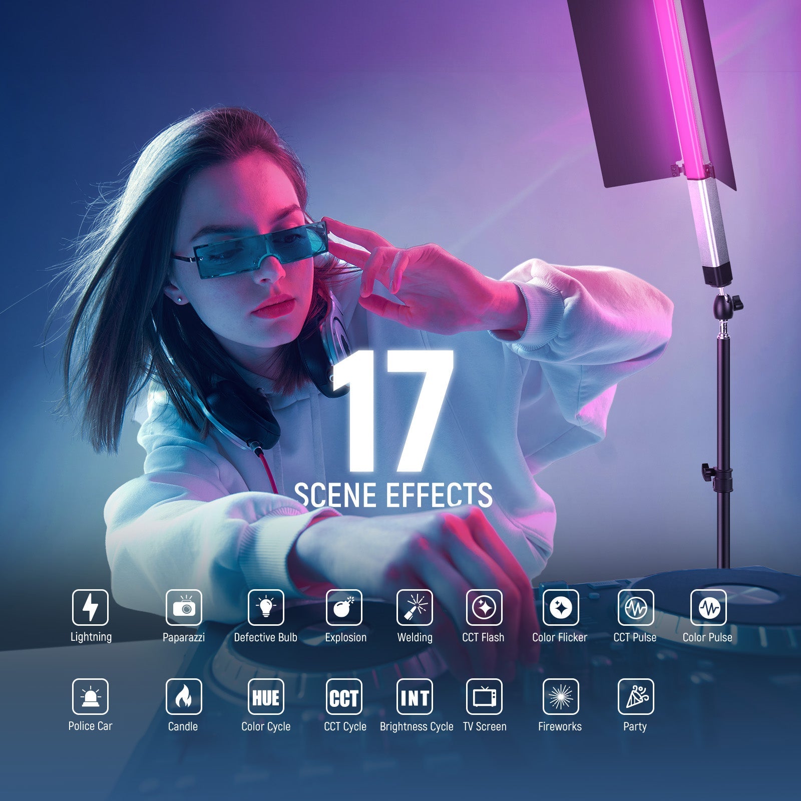 - 17 Scene Effects Metal Barndoors- 17 special scenes (Thunder & Lightning, Paparazzi, Defective Bulb, Explosion, Welding, CCT Flash, Color Flicker, CCT Pulse, Color Pulse, Police Car, Candle, Color Cycle, CCT Cycle, Brightness Cycle, TV Screen, Fireworks, Party) bring realistic light effects to your videos. Two aluminum alloy barndoor flaps control light spills and create dramatic shadows