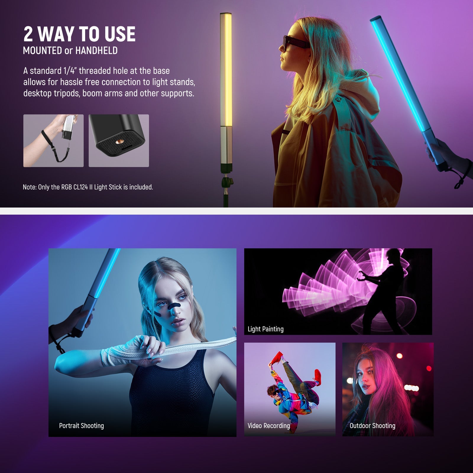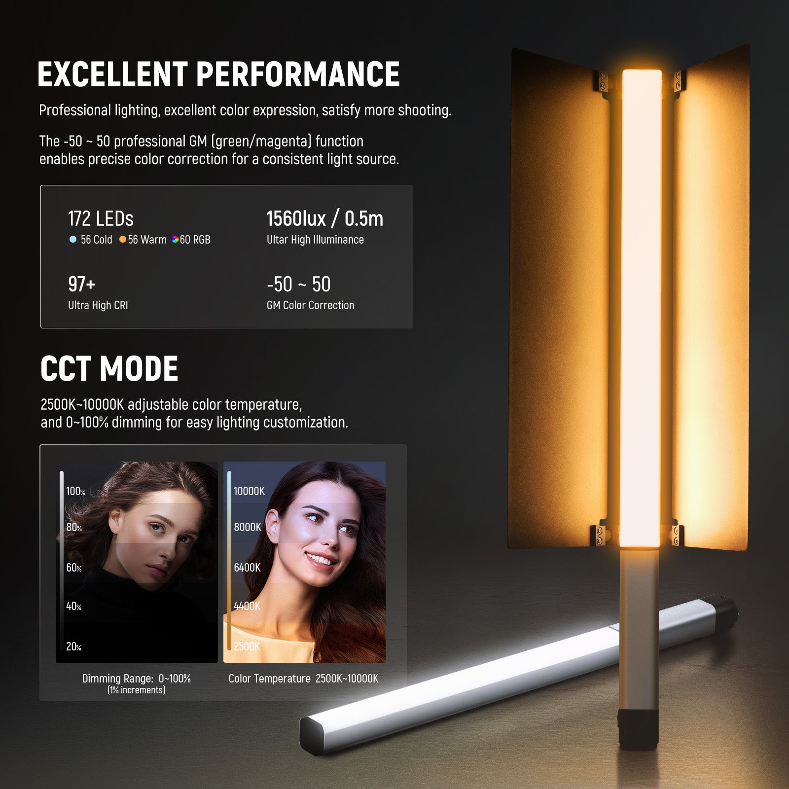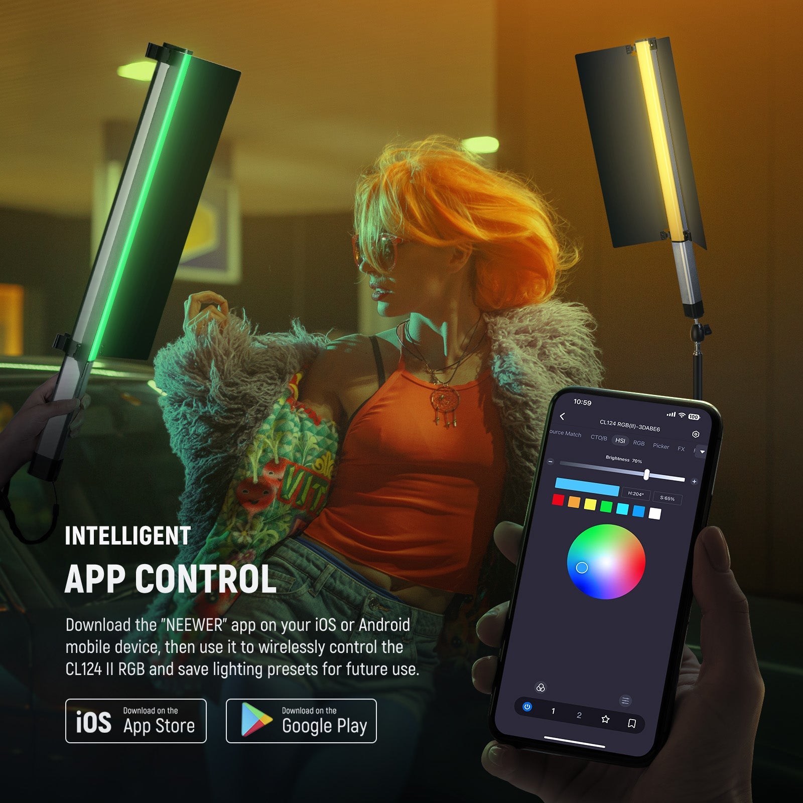 - Versatile& Powerful RGB Light Stick- NEEWER CL124 II RGB Light Wand features 172 LEDs (56 cold white, 56 warm white, and 60 RGB), 1560lux/0.5 illuminance, CRI 97+/TLCI 97+ for accurate color reproduction, 2500K-10000K bi color lighting, +/-50 GM color correction, 360° full colors, 0-100% precise and flicker free PWM dimming in 1% increments