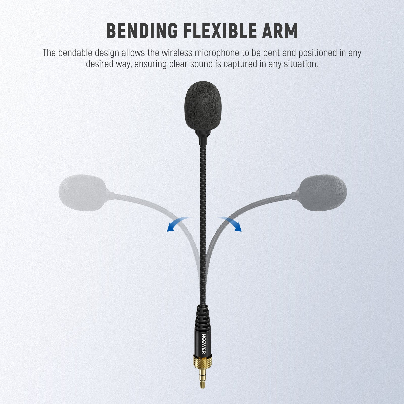 - Wireless Mics with Flexible Arm and Foam Cover- Overall length is 16 cm (14.5 cm without the 3.5mm TRS head). Condenser Mic's bendable design allows the wireless microphone to bend and position itself any way it needs to, ensuring that clear sound is captured in any situation. Featuring a flexible arm bendable boom and a sturdy metal mic, this design includes a windproof foam cover that protects the microphone from dust, moisture, and corrosion damage