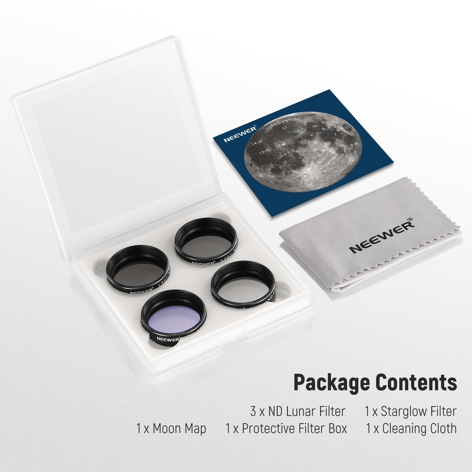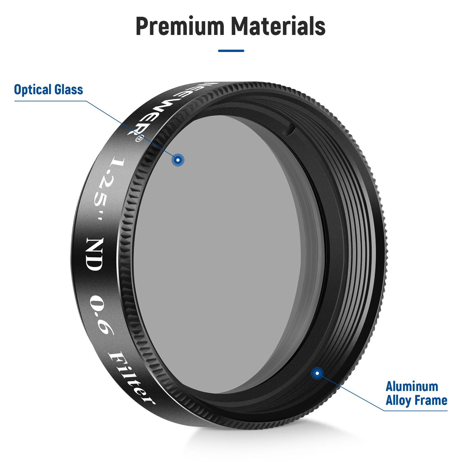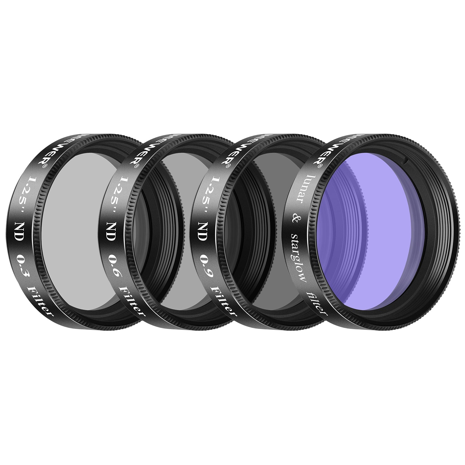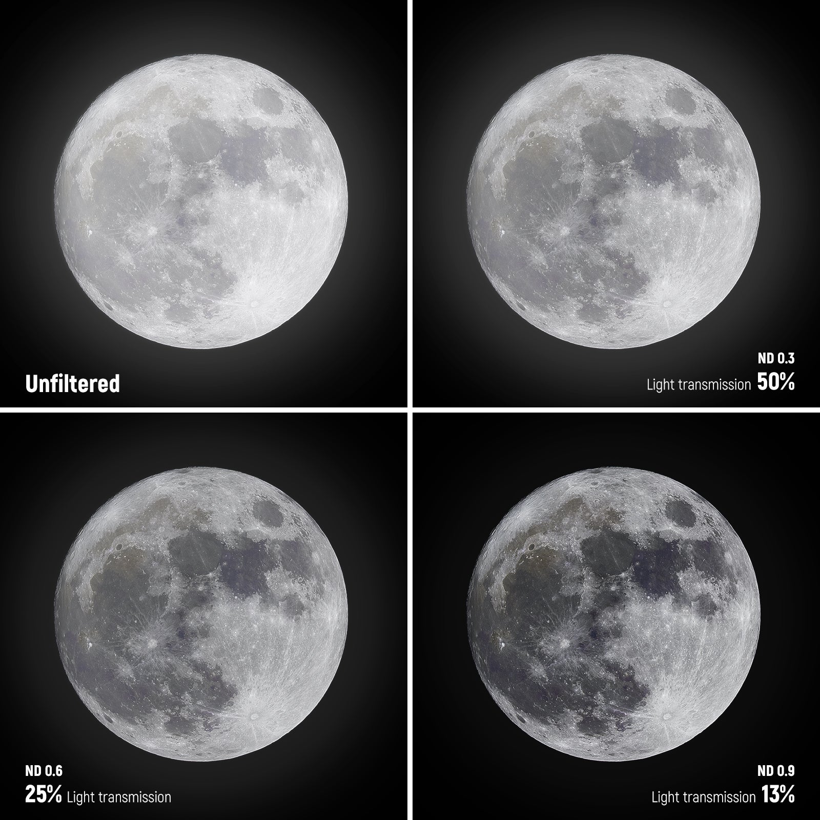 - 3 Neutral Density Lunar Filters- 3 ND filters reduce the light transmission in different moon phases. 13% light transmission for ND0.9, 25% light transmission for ND0.6, and 50% light transmission for ND0.3