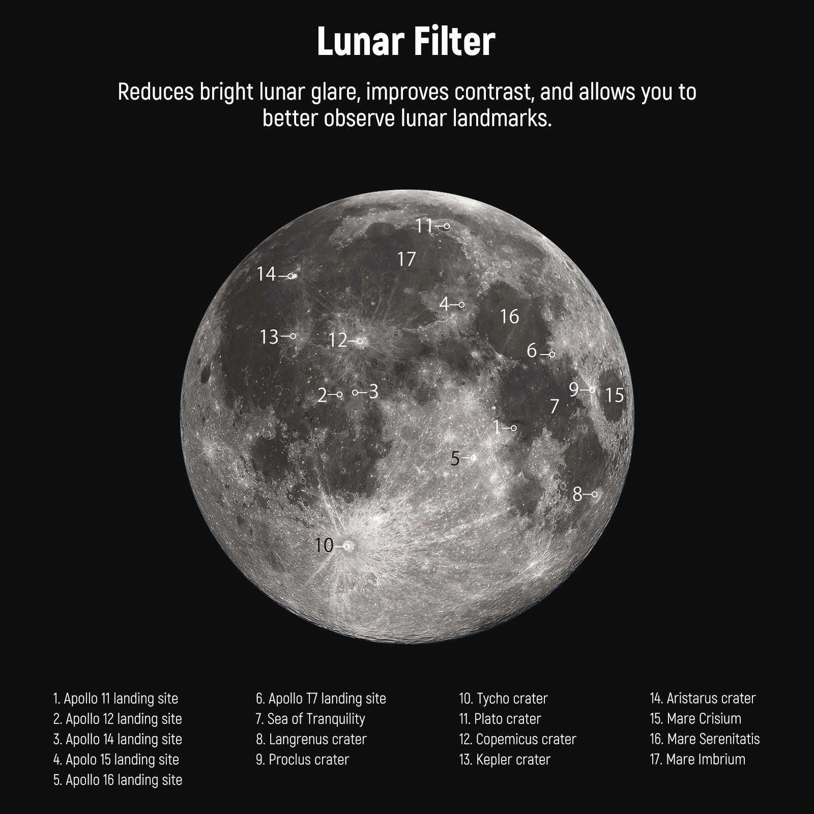 - Lunar Starglow Filter- Suitable for all moon phases, the lunar starglow filter reduces light pollution caused by urban streetlamps, scatters atmospheric lighting caused by the moon, and improves color rendition