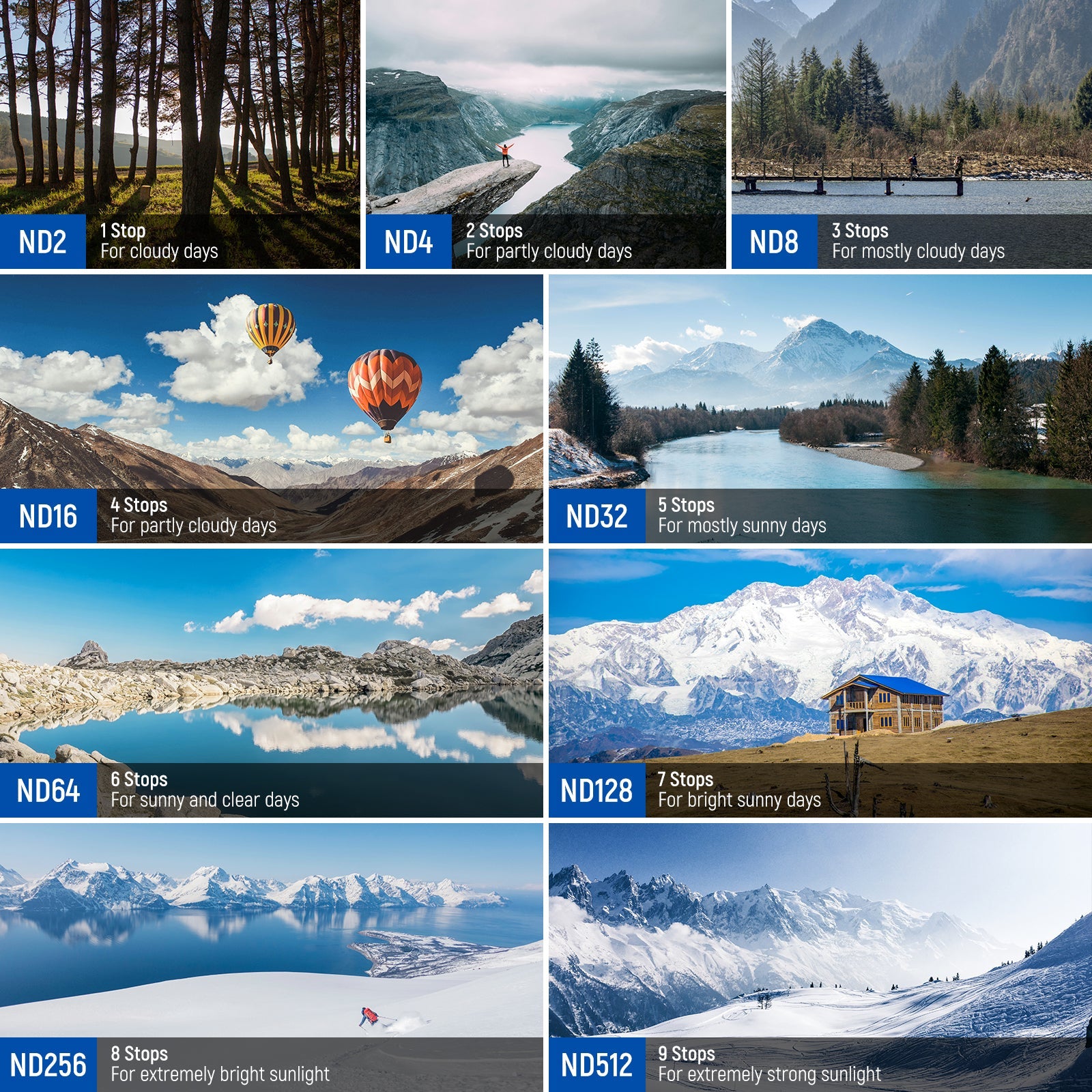 - Effortless Exposure Balance- These two variable ND filters offer 1-5 stops and 6-9 stops of light reduction respectively, suitable for long exposure photography on sunny and bright outdoor conditions. They allow you to shoot at slower shutter speeds with larger apertures and bring expressive motion blur effects on moving subjects