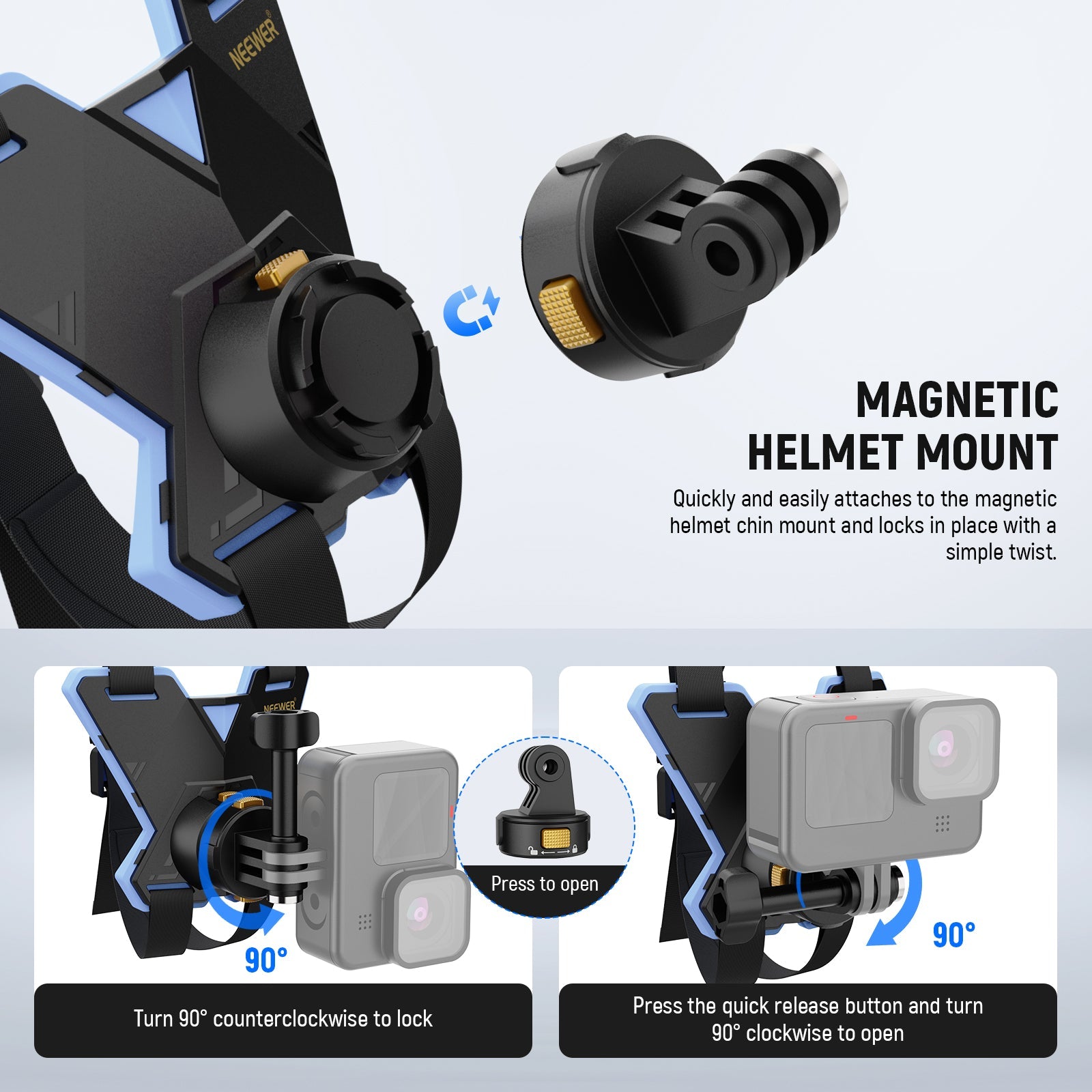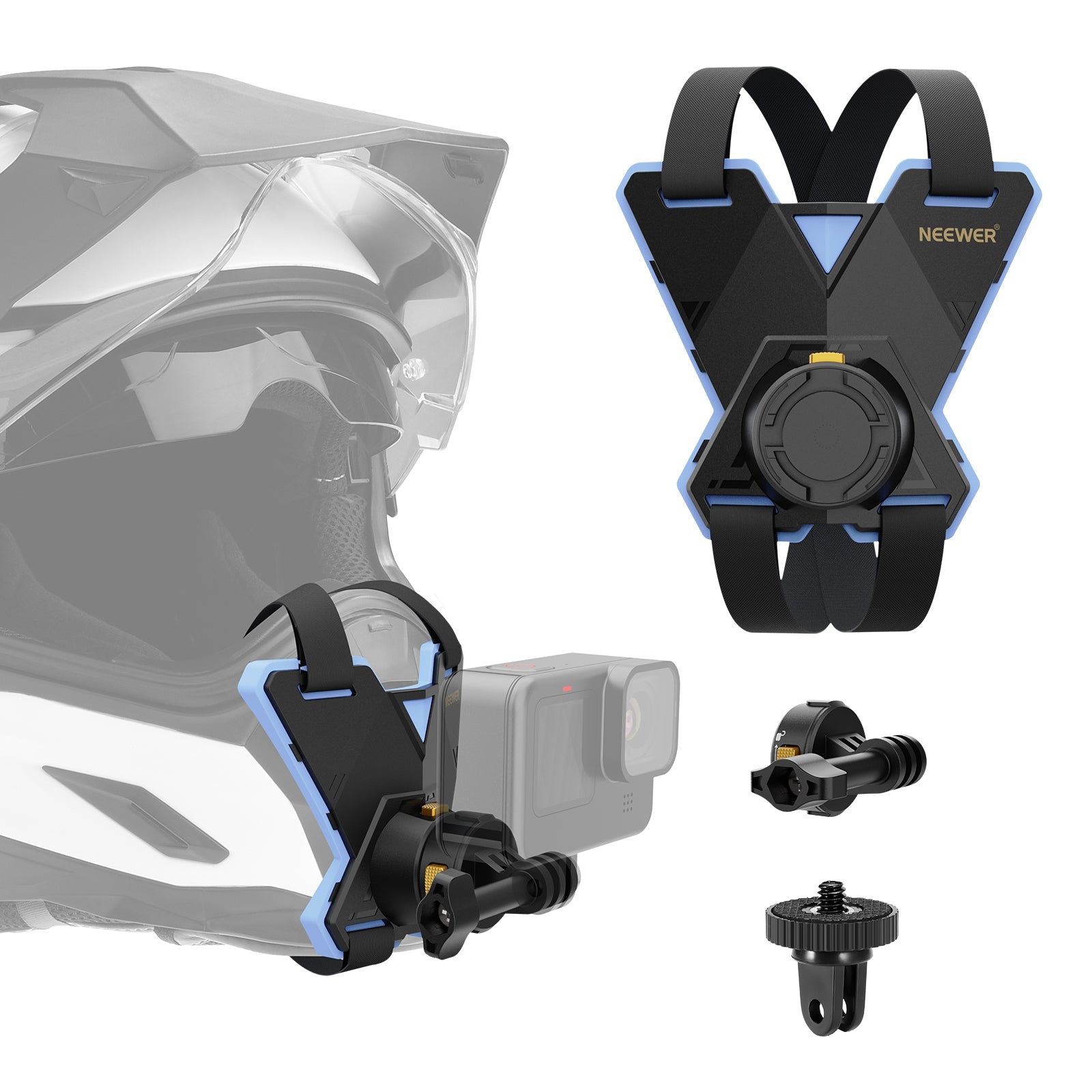 - Made for Your Helmet- NEEWER GP19 Helmet Chin Strap Mount Accessories kit fits most motorcycle and dirt bike helmet brands and models. It is quick and easy to install via a quick release buckle. This hands free action camera helmet mount holder helps you record exciting and thrilling point of view (POV) footage and video recording of riding, as well as riding conditions, ideal for motorcycle dirtbike lovers and seasoned pros