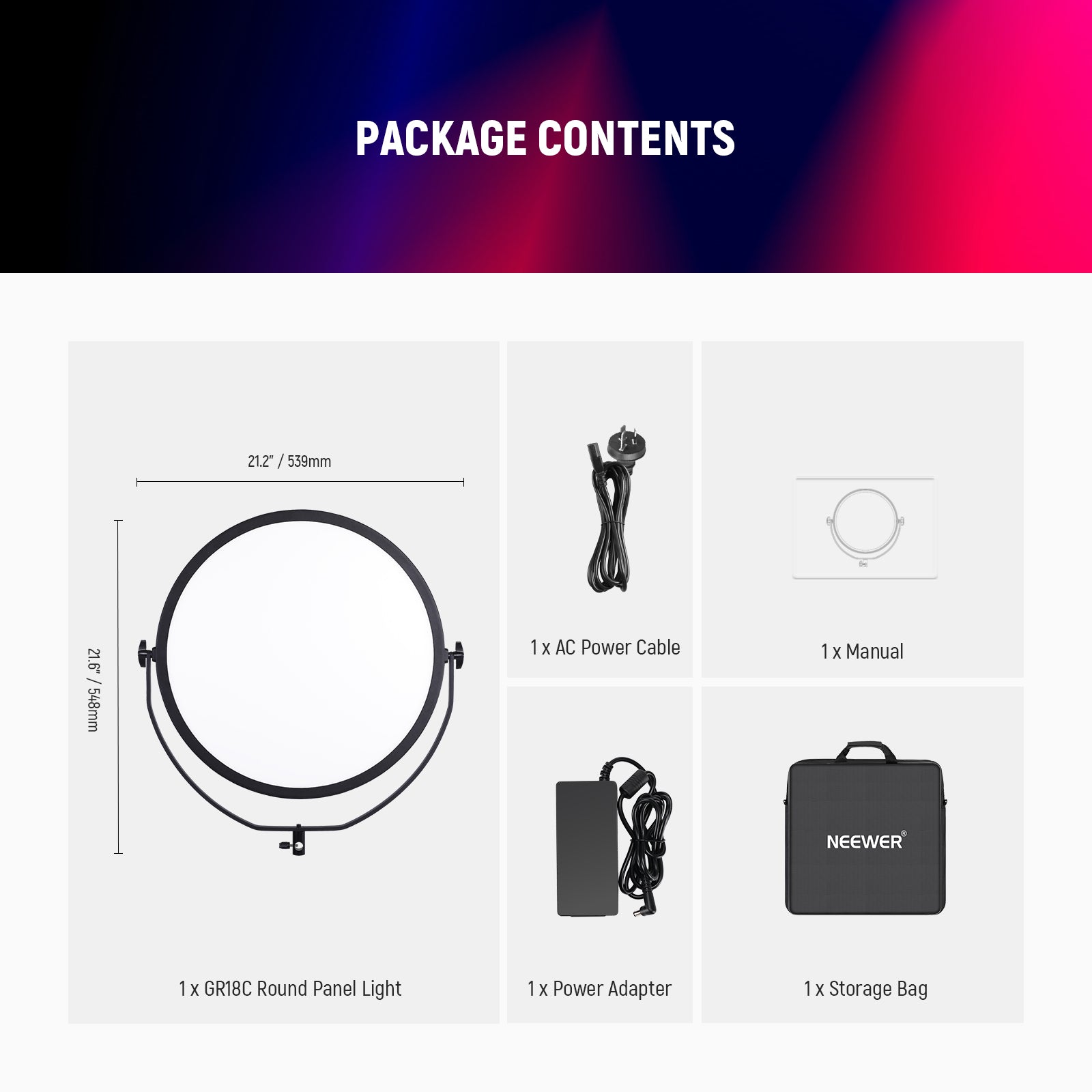 - 18" RGB Full Color & Pioneering Edge Lit Tech- Thanks to the advanced LED edge lit technology, this 65W round fill light features an 18" diameter and a generous 2.3cm thick panel that delivers 360° full color lighting gentle on the eyes, defining facial features with a 6000lux/0.5m max illuminance without glare. With a 97+ CRI & TLCI rating, 0~100% dimming, 2500K~8500K bi color temperature, and a bag for portraits, beauty & fashion shots, live streaming, product photography, etc.
