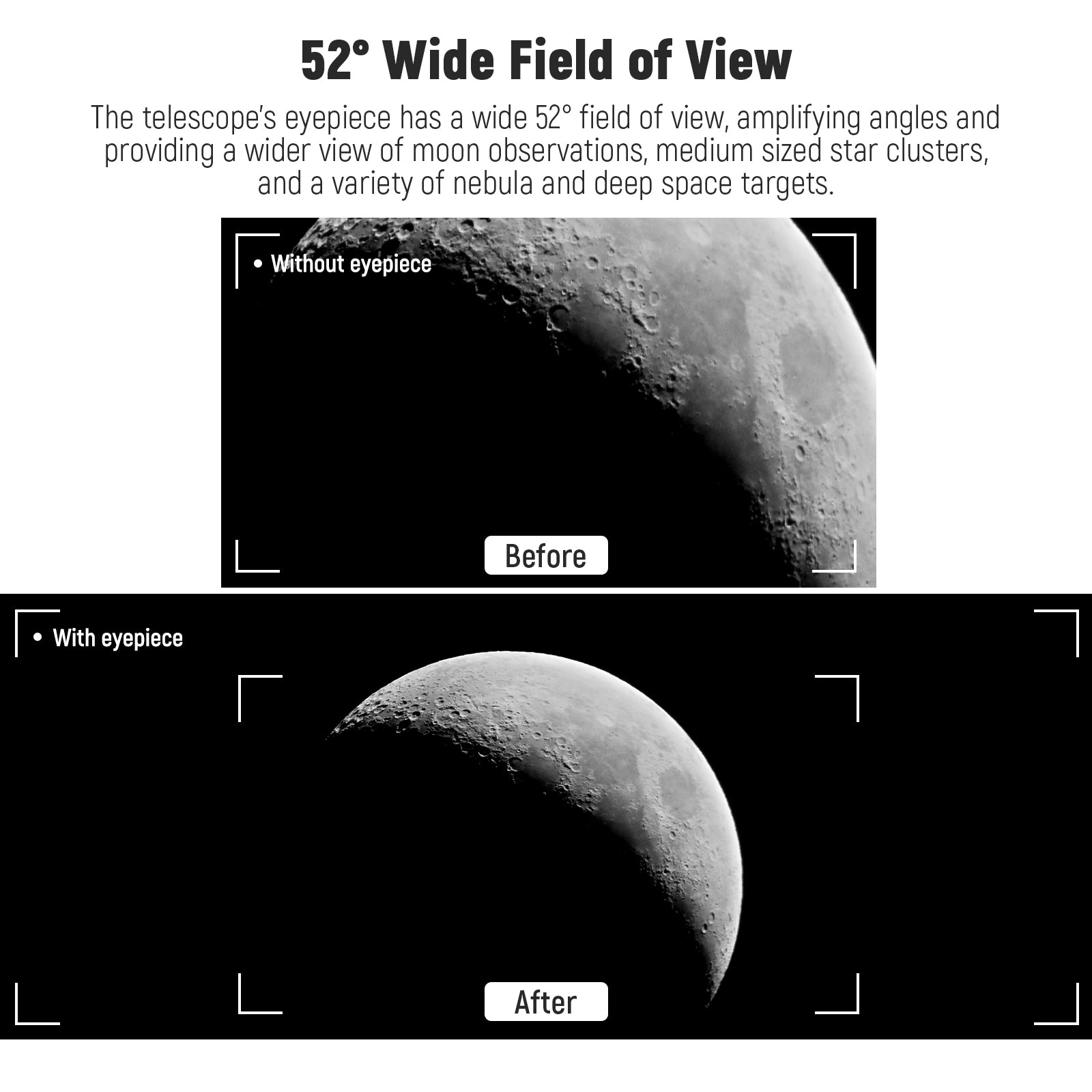 - 52° Wide Apparent Field of View- The telescope eyepiece with a wider 52° apparent field magnifies the angle and provides a broader perspective for lunar observations, medium sized star clusters, and a wide range of cloudy nebulas and deep sky targets