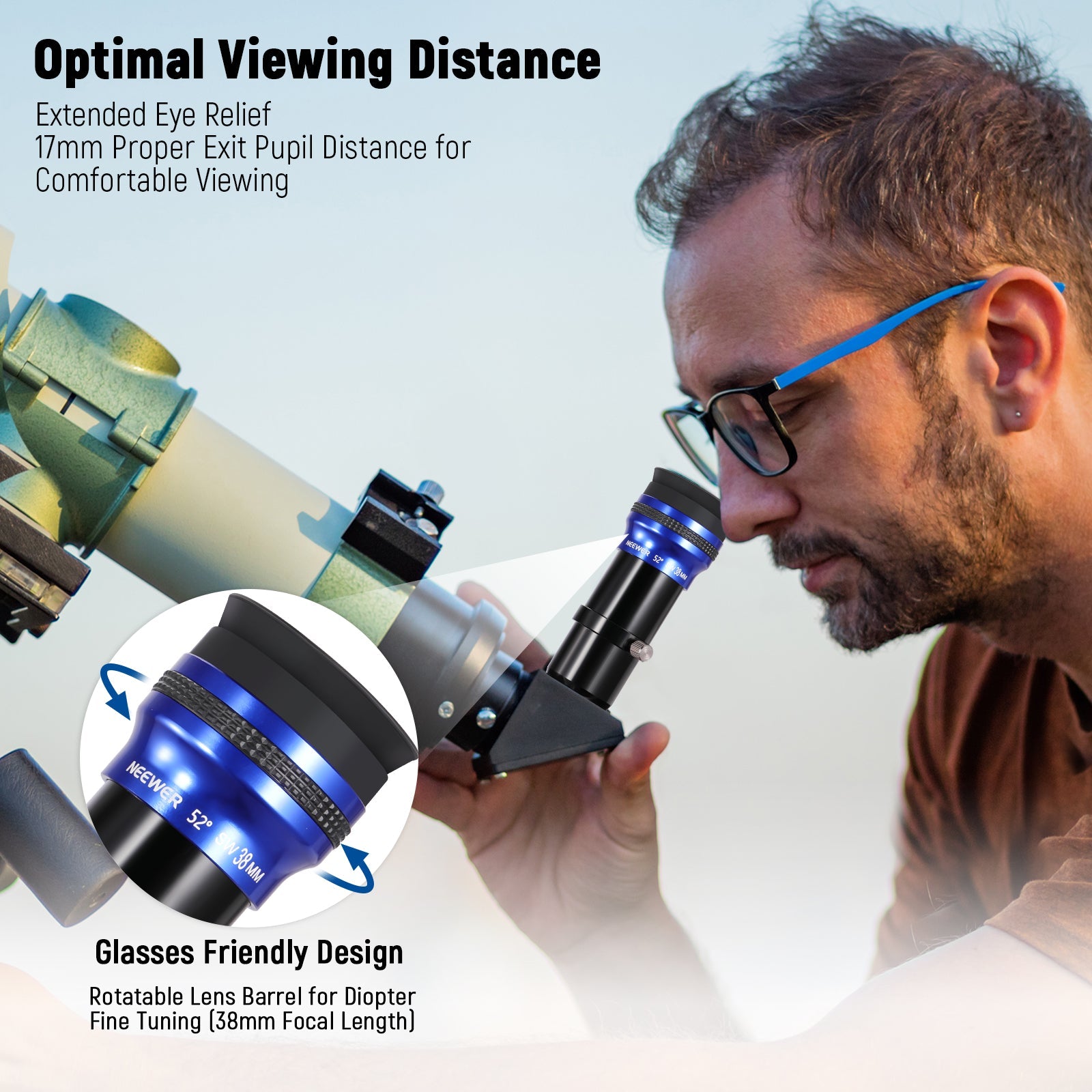- Fine-Tuned Focal Length- With a fixed focal length of 38mm, the eyepiece still offers a rotatable lens barrel to fine tune for glasses wearers, who can rotate to find the most comfortable distance without removing their glasses