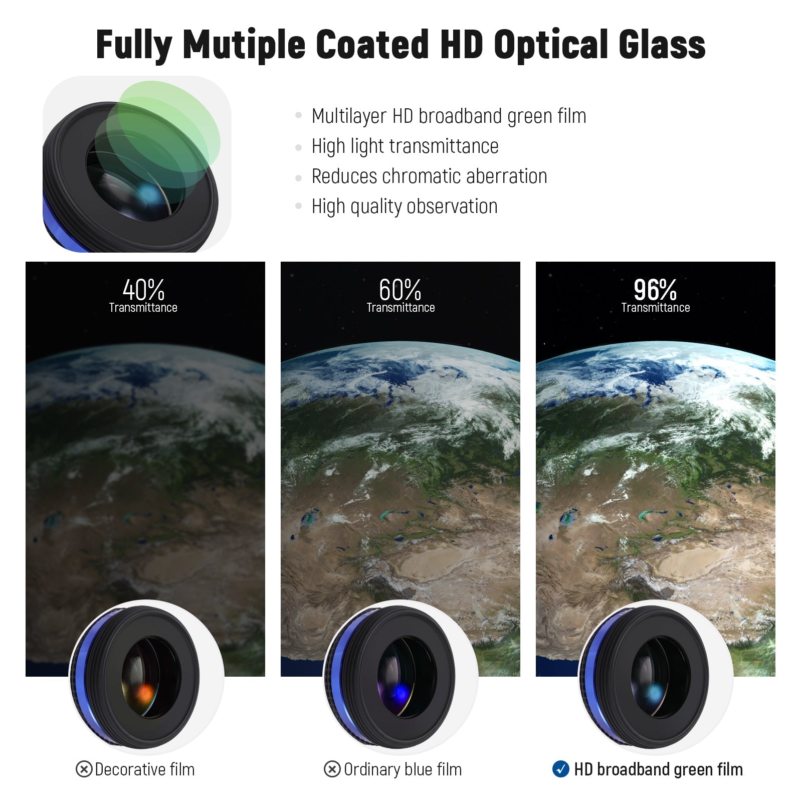 - Fully Mutiple Coated HD Optical Glass- Two sets of four slices of fully multi-coated HD optical glass reduces the chromatic aberration and increase lens permeability to get bright and clear views with impressively high contrast. The included dust covers keep the lenses free from dust or damage