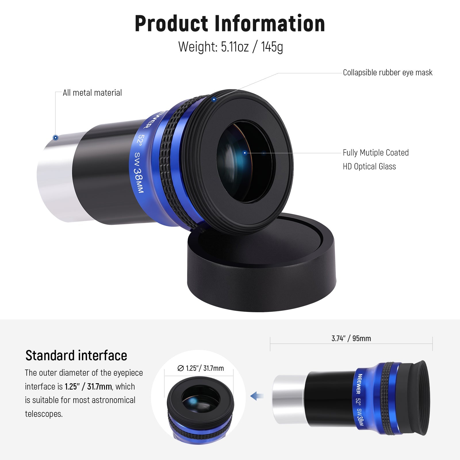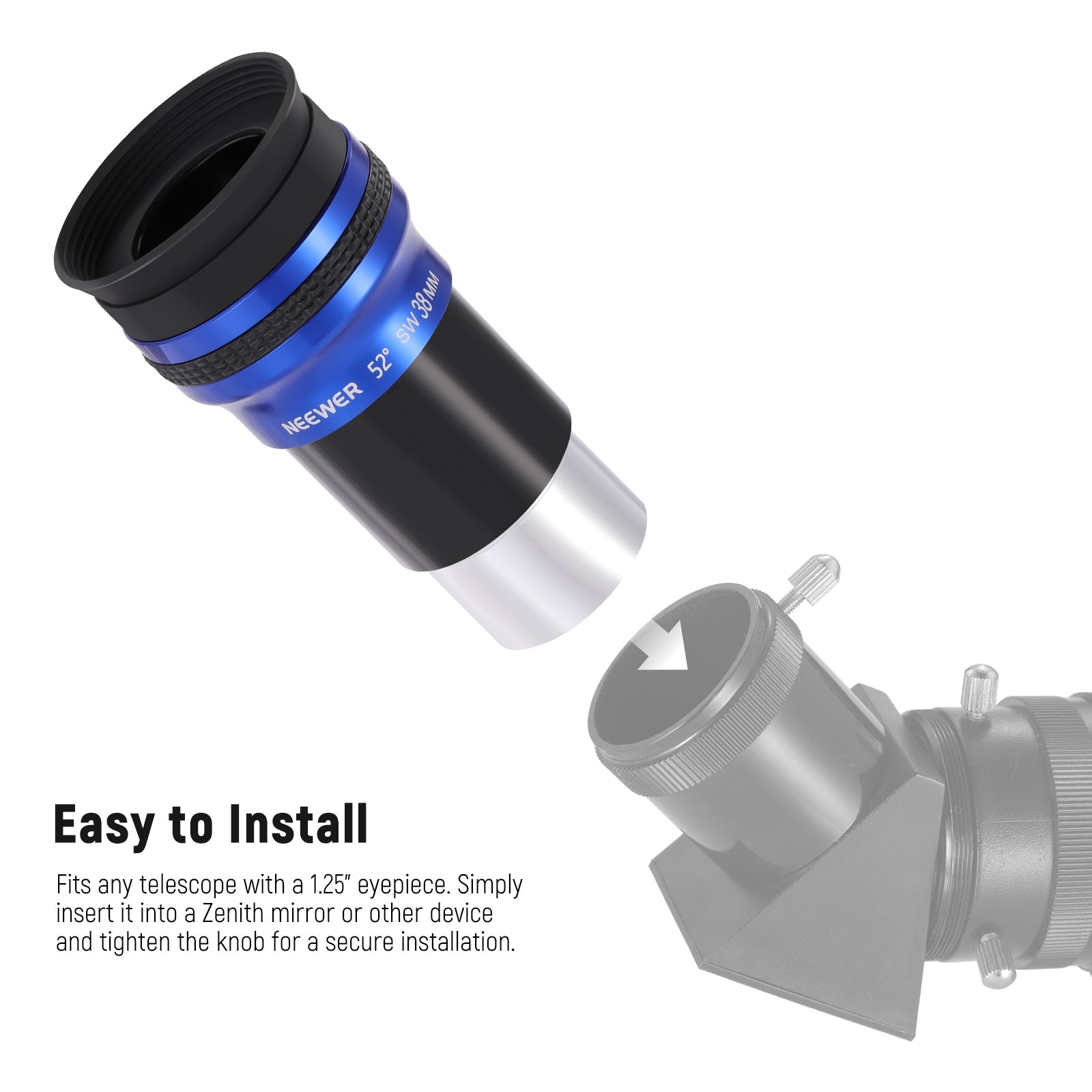 - 1.25" Standard Interface- Comes with a standard 1.25" interface to connect any telescopes that support 1.25" eyepieces. To securely attach to the zenith mirror or other devices, simply insert it into the eyepiece hole and tighten the knob to complete the installation