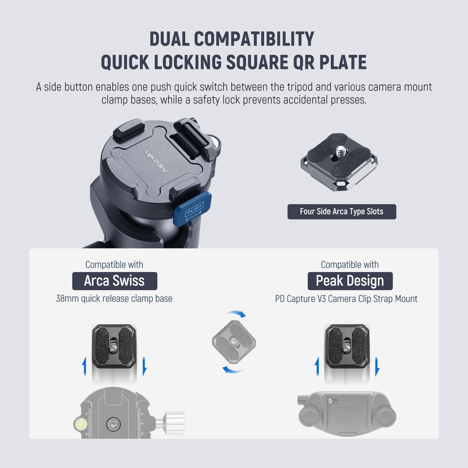 • Quick Release Arca Type QR Plate- The Arca type quick release plate is also compatible with the Peak Design Capture Clip V3. A side button enables one press attachment and removal of your camera, allowing for quick transitions between the tripod and other camera mount clamp bases. A safety lock is incorporated to prevent accidental activation of the release button. Note: QR clamp is compatible only with PD QR plates and included Arca type plates