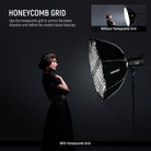 - Honeycomb Grid & Diffusers- The honeycomb grid can make the light shape confined and directional, giving a dramatic and expressive light effect to define the model’s facial structure. Two quality diffusers can be combined or used separately for different effects