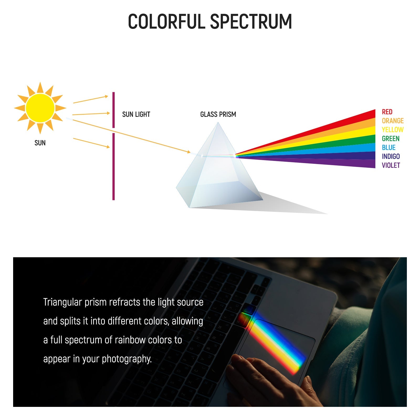 - Colorful Spectrum- Triangular prism refracts a light source and splits it into different colors, allowing a full spectrum of rainbow colors to appear in your photography