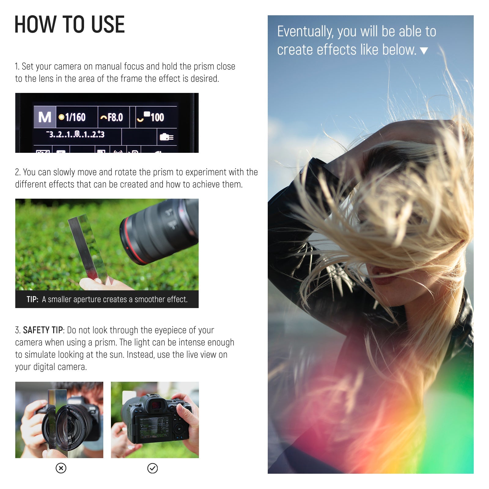 - Broad Application- Designed to add creative effects to your photoshoots, including rainbows, lens flare, and color cast. Perfect for portraits, album covers, wedding photos, landscapes, science projects, light analysis, and more