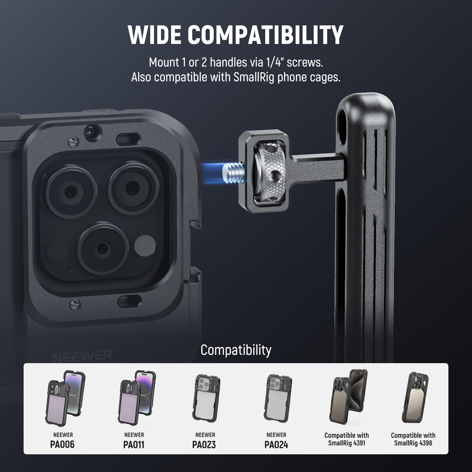 - Universal 1/4" Screws- Effortlessly mount one or both of the handles to your phone cage via 1/4" screws, compatible with SmallRig and NEEWER phone cages PA006 PA011 PA023 PA024 (sold separately) and more