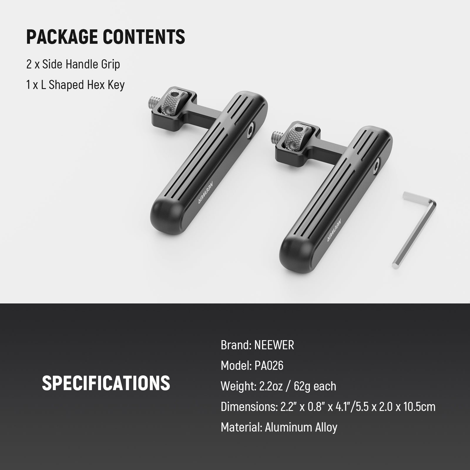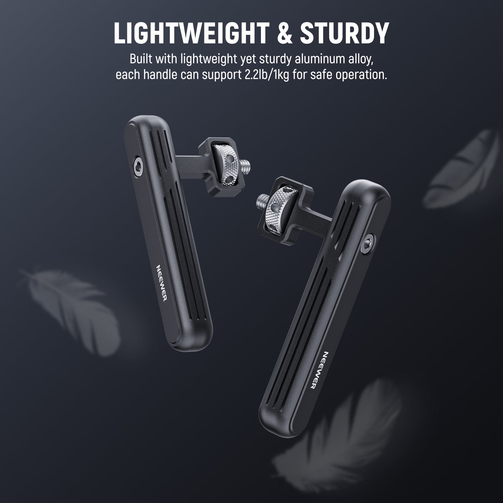 - Portable & Comfortable Handling- Built with lightweight yet sturdy aluminum alloy, each handle supports 2.2lb/1kg at ease. Each compact at a size of 2.2"x0.8"x4.1"/5.5x2.0x10.5cm and lightweight at merely 2.2oz/62g, no more strains for extended shooting or filming, and easily carried around for photography on the go