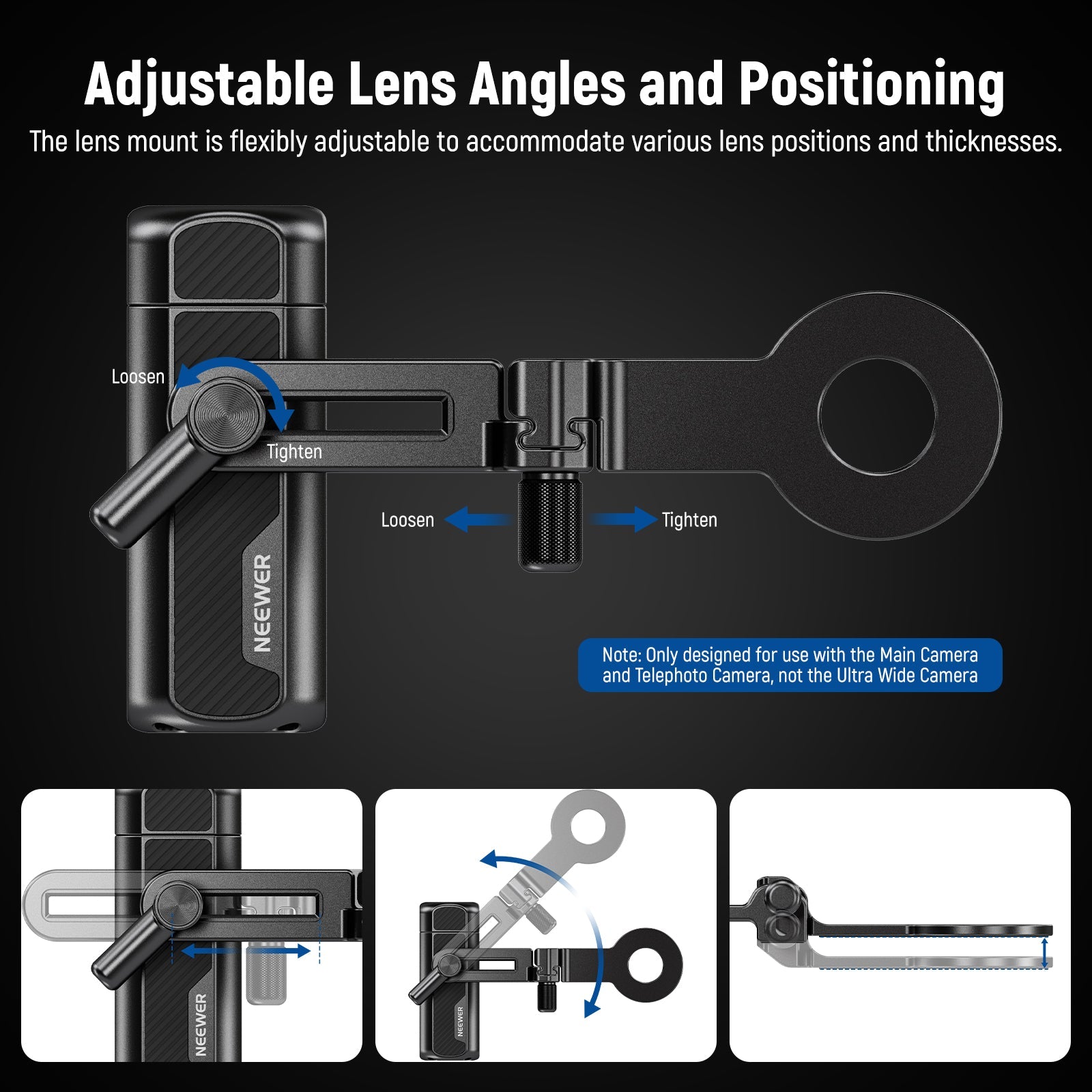 - Adjustable Lens Angles and Positioning- The lens mount is adjustable to accommodate various lens positions and thicknesses. Note: Designed for use with the Main Camera and Telephoto Camera only, not the Ultra Wide Camera