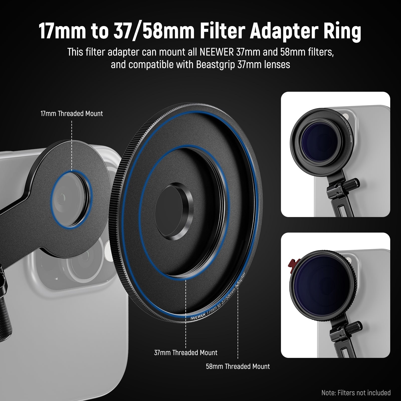 - 17mm-37/58mm Filter Adapter Ring- This filter adapter fits all NEEWER 37mm and 58mm filters, like UV, ND, variable ND, CPL, black diffusion, light pollution, and graduated color filters, and is compatible with Beastgrip 37mm lenses