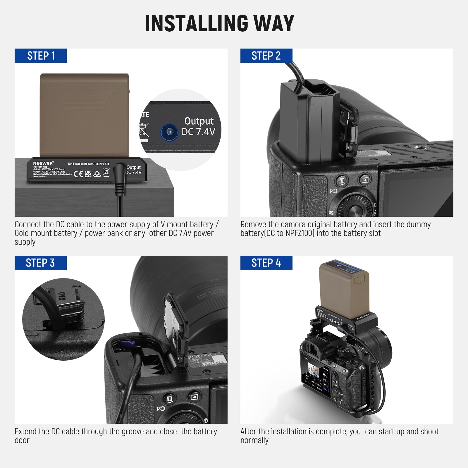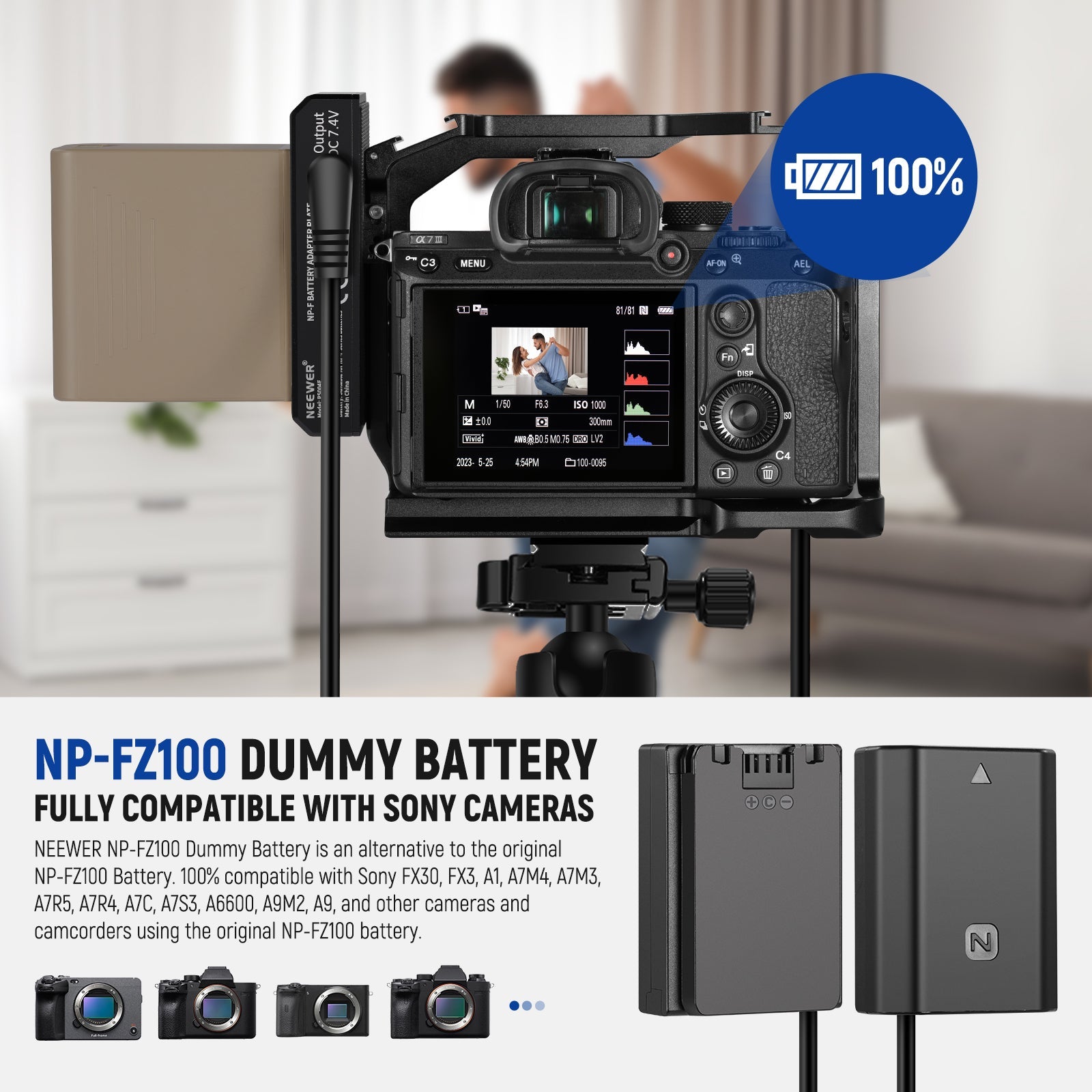 - Wide Compatibility- NEEWER PS004E Battery Adapter Plate suits all NP-F series batteries, including NP-F970, NP-F750, and NP-F550. While the NP-FZ100 Dummy Battery is compatible with Sony FX30 FX3 ZV-E1 a1 a9 a9 II a7S III a7R V a7R IV a7R III a7C a7 IV a7 III and a6600 cameras