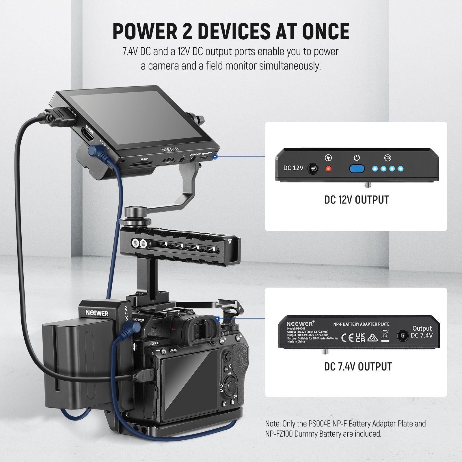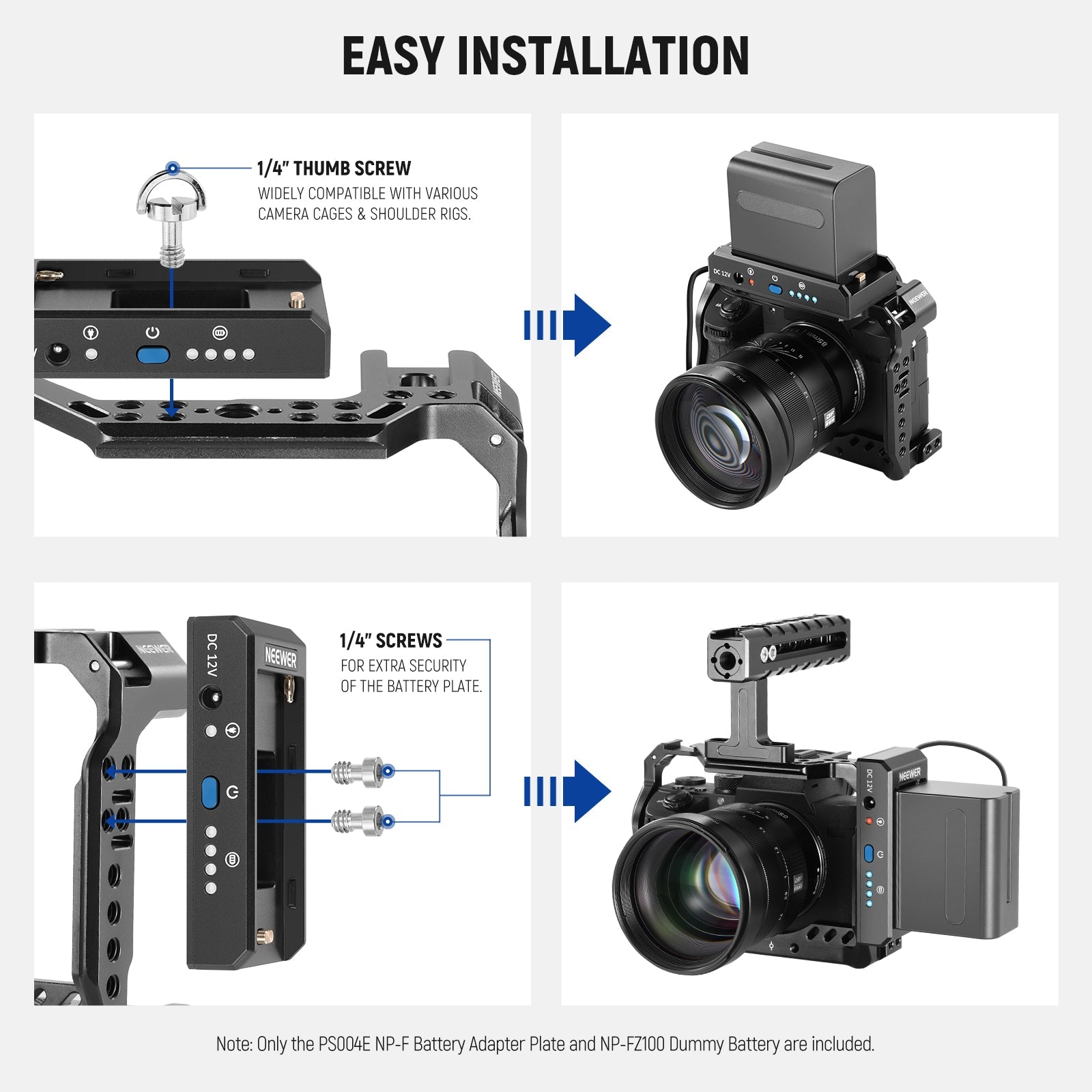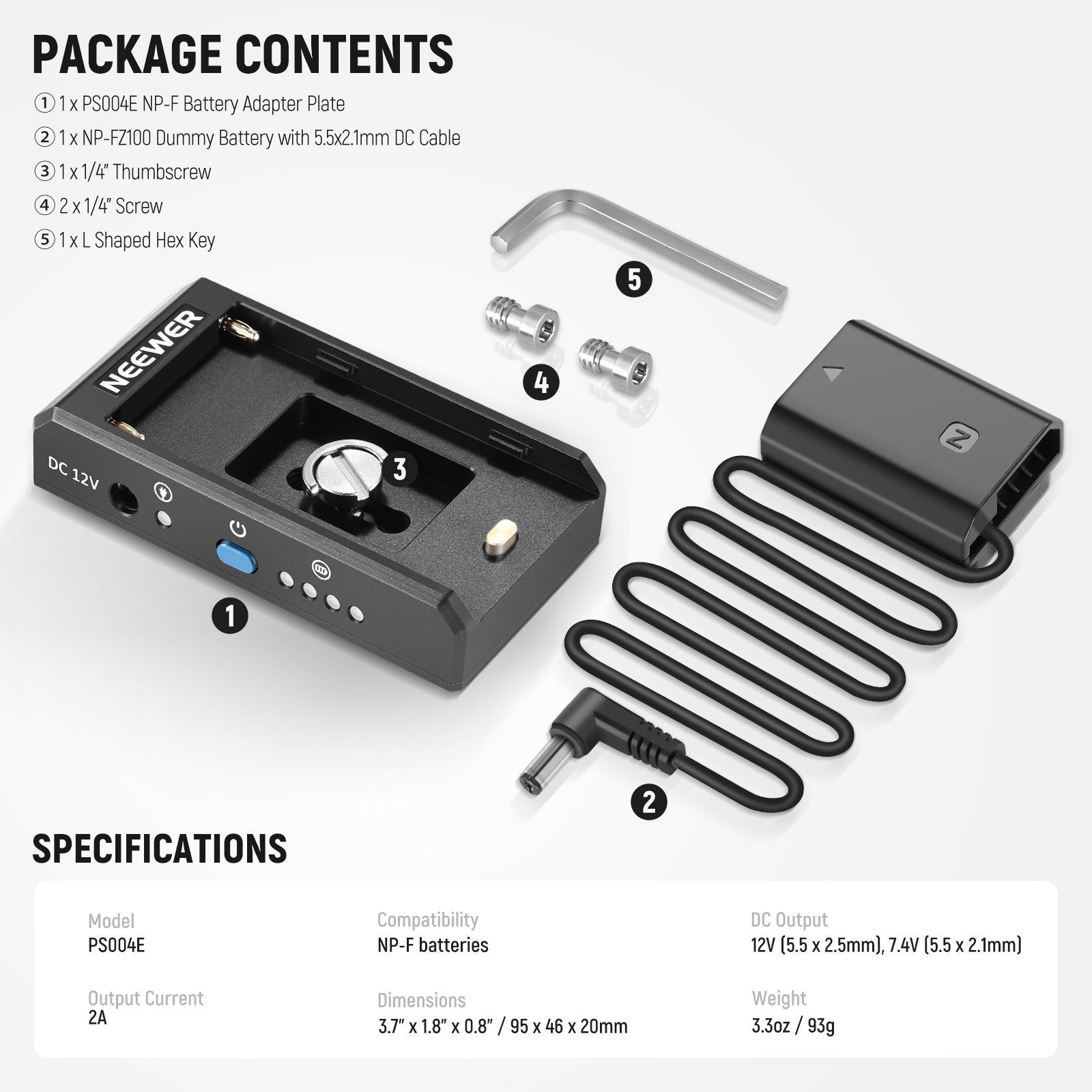 - Amplify Battery Power- PS004E Battery Adapter Plate can mount a high capacity NP-F battery on a camera cage via the 1/4¡± screw and provide sufficient power to your camera for outdoor shooting. NP-FZ100 dummy battery with a 5.5x2.1mm DC cable can connect to PS004E via the 7.4V output port
